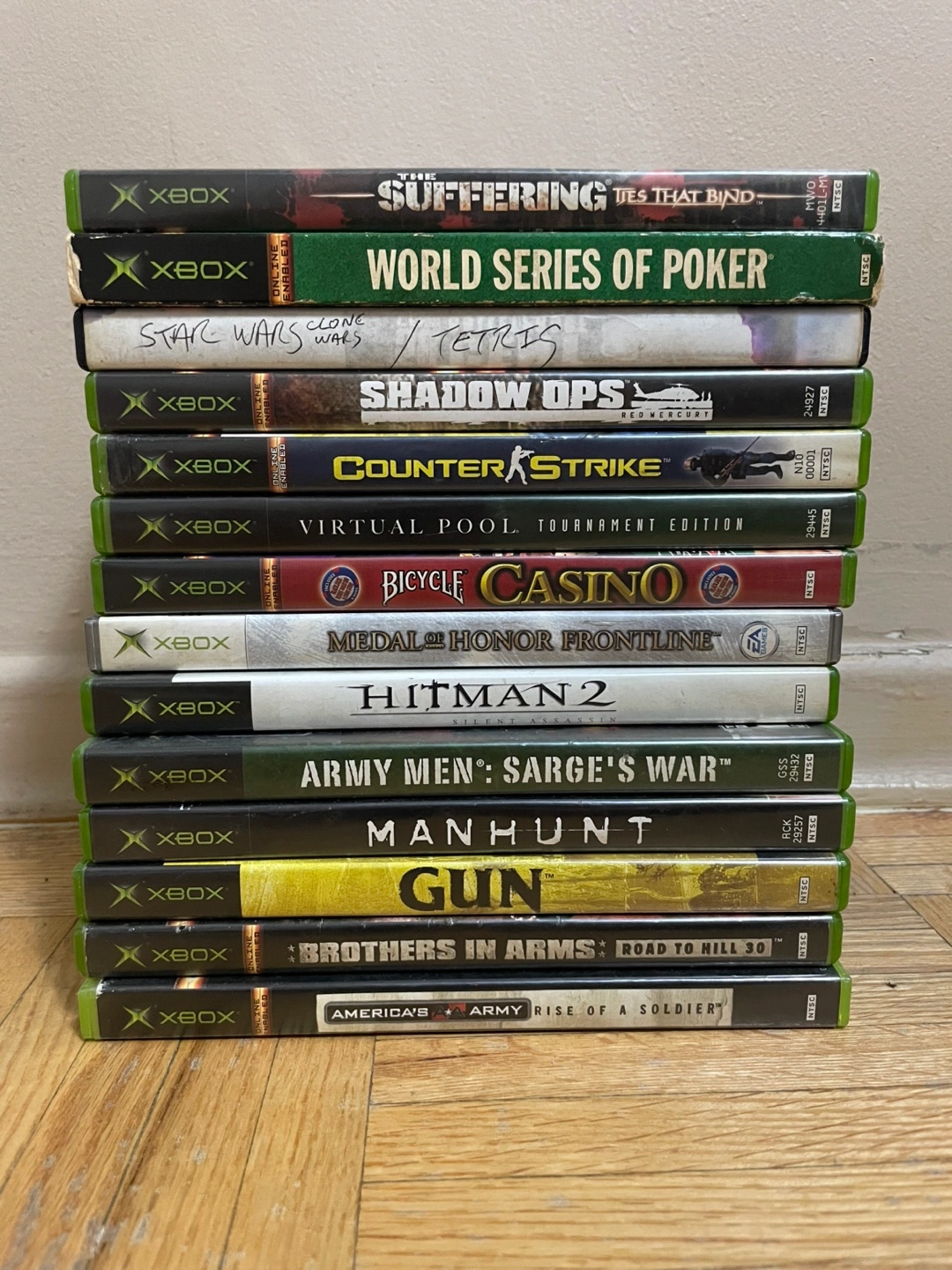Multiple Xbox games are shown. Stack of several game titles. Games include titles like Hitman 2, Counter Strike, and Star Wars. These games would be perfect for a night of relaxing.