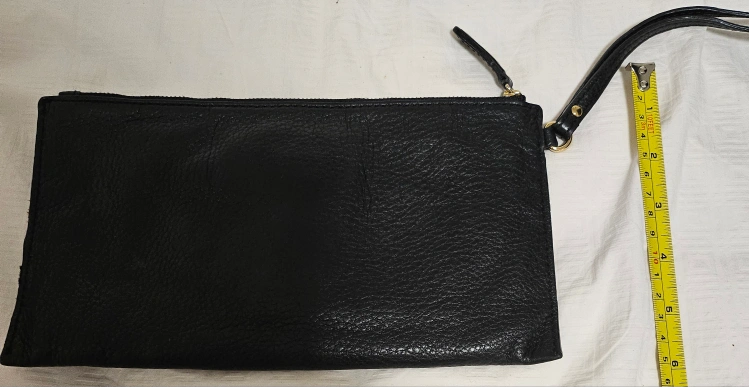 Black wristlet, with a zipper closure. Wrist strap on the side for easy carrying. A small, stylish accessory to keep your essentials safe and accessible in your hands.