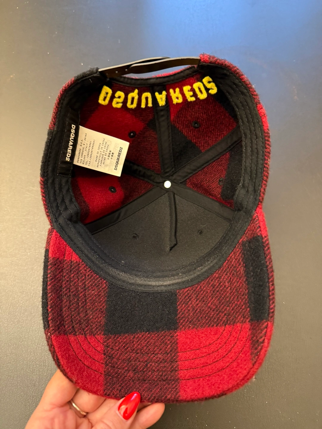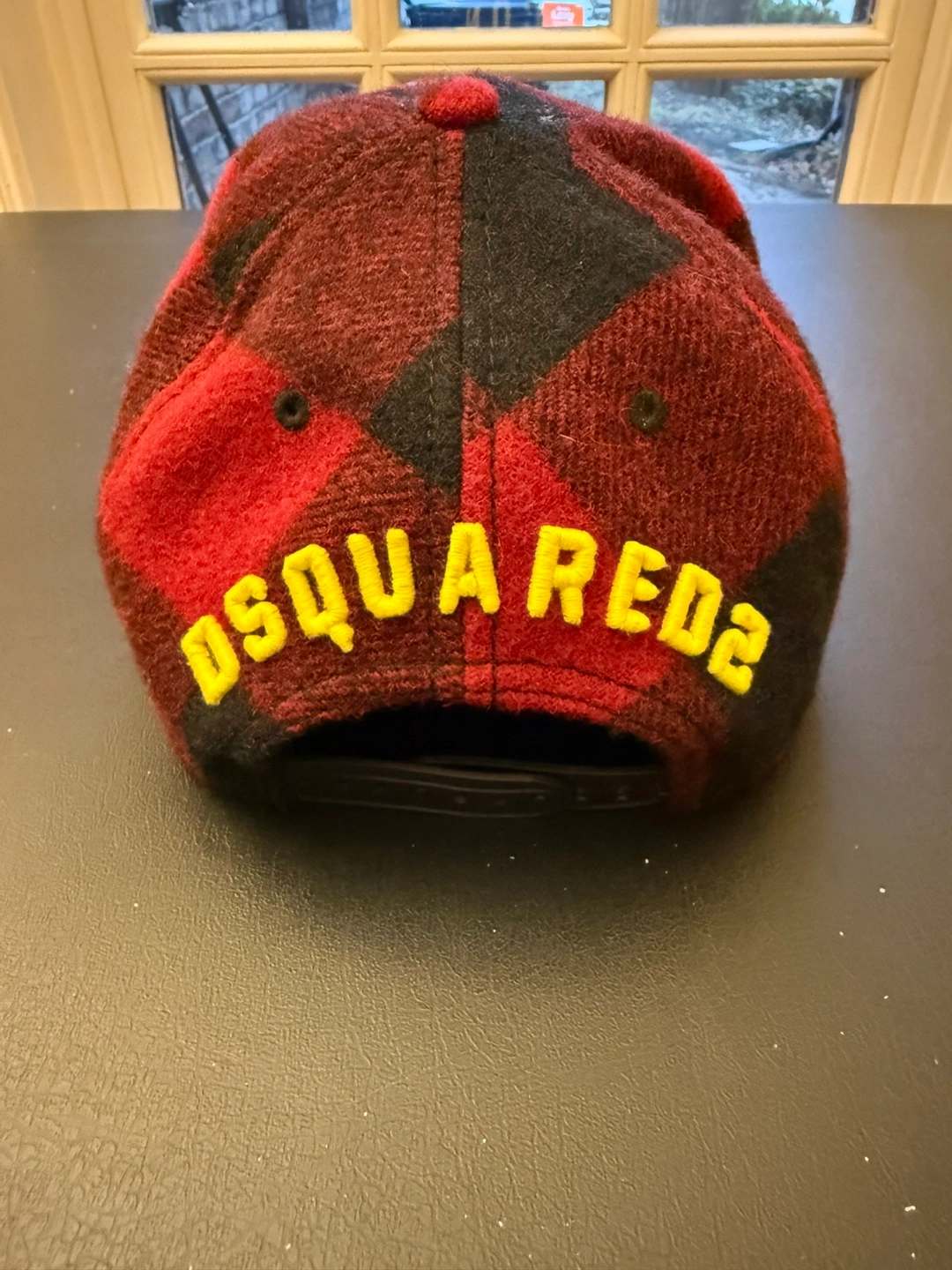 Red and black checked cap. Featuring a curved brim. Embroidered yellow lettering. Adjustable back strap. Putting this on will definitely brighten your day.