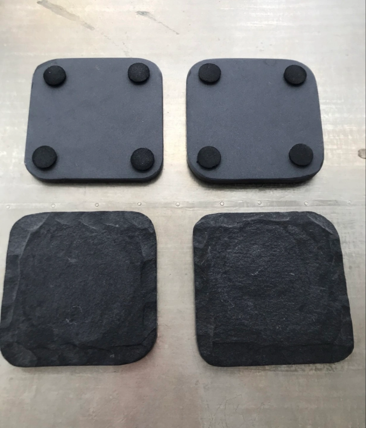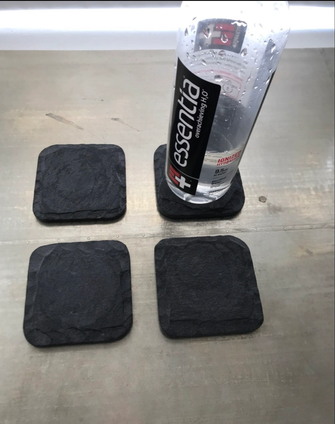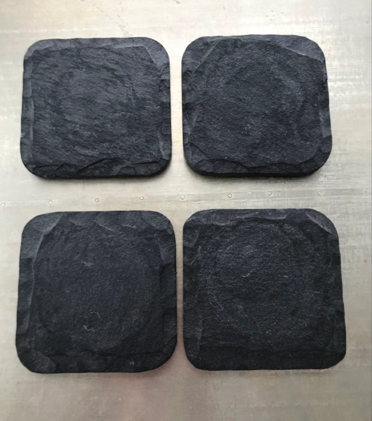 West Elm Four square coasters. They have a dark gray color. Textured surface with a natural look. Ideal for protecting your surfaces, allowing you to unwind in the comfort of your home.