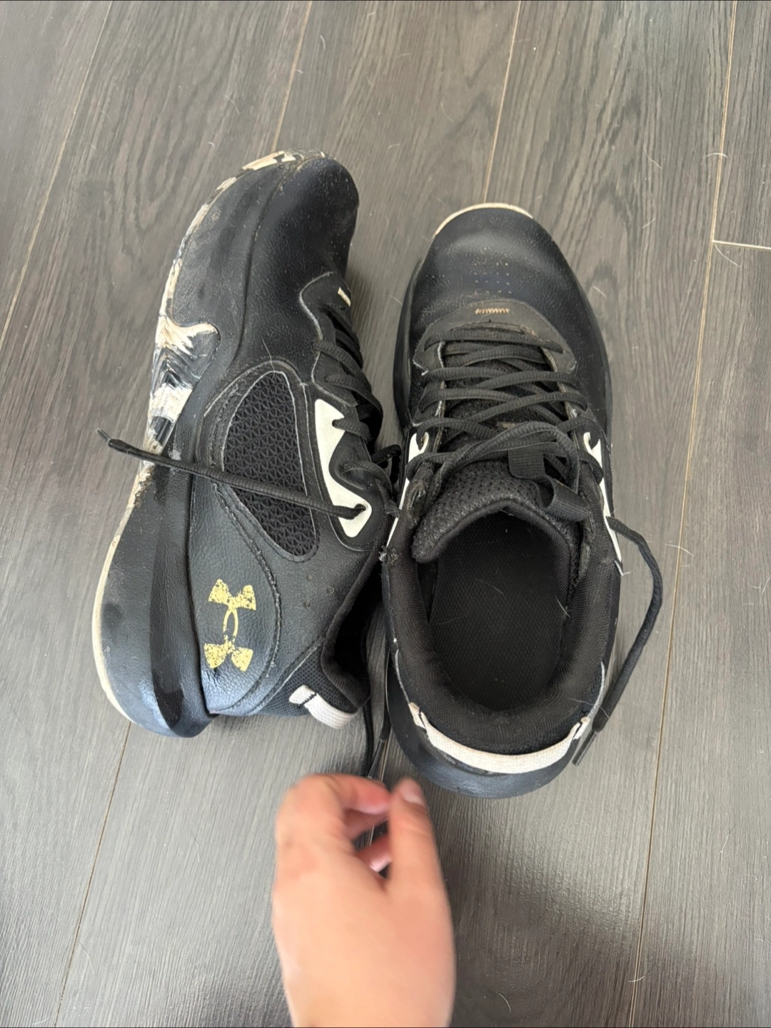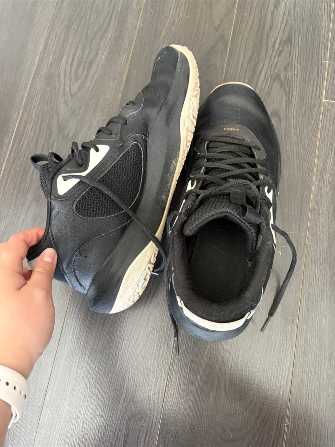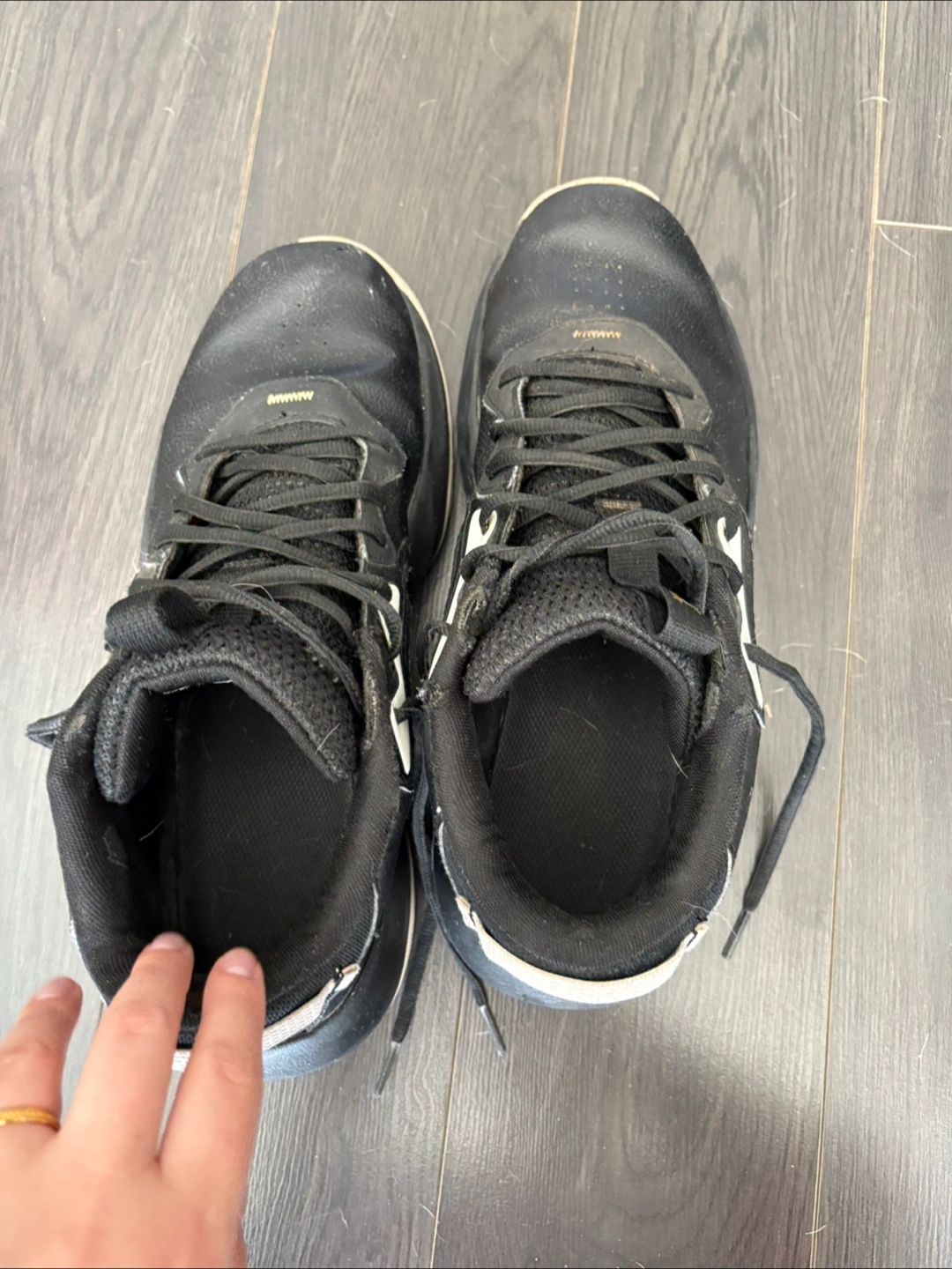 Black sneakers with white accents. Laces on top. Perfect for a casual day out.