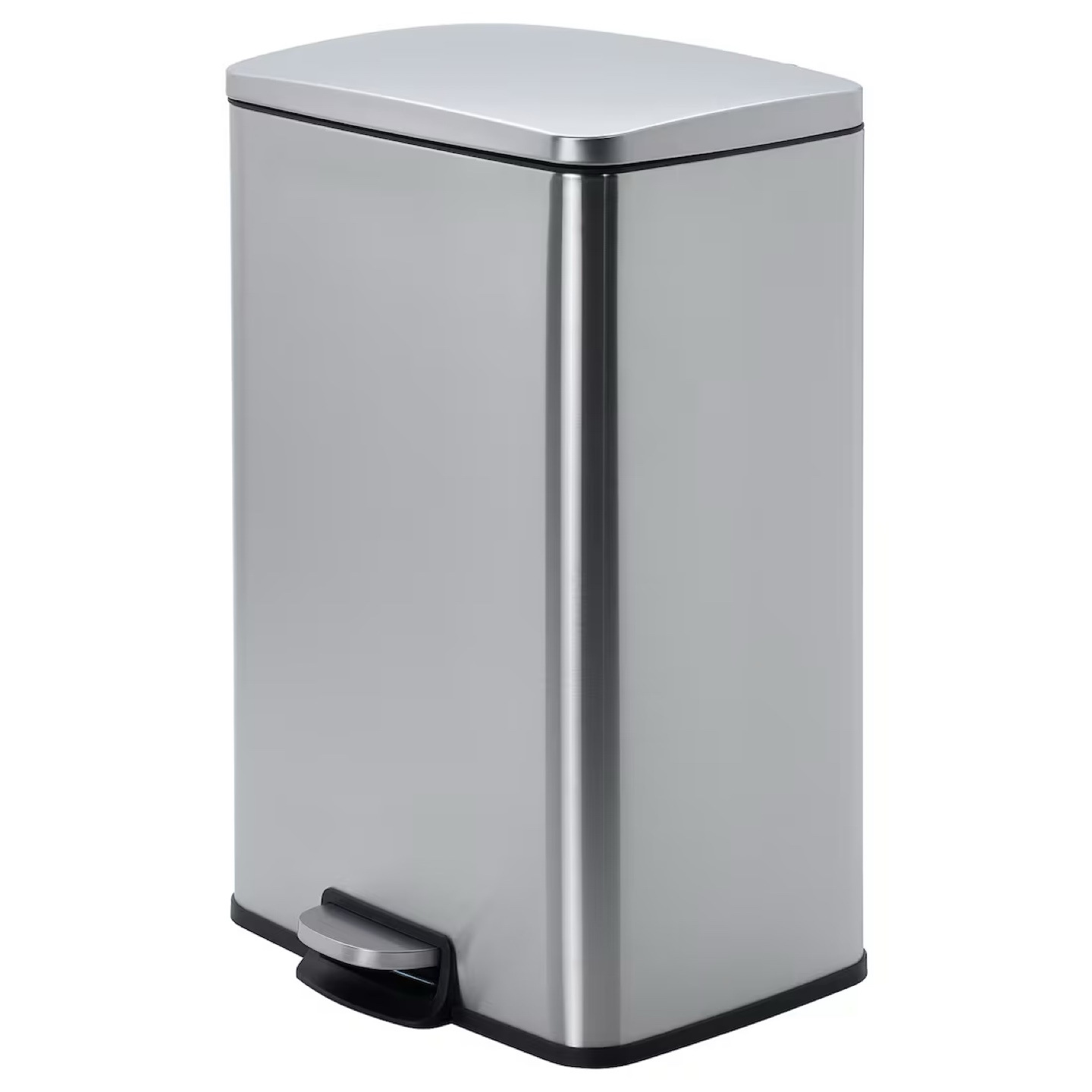 IKEA Sulten silver step trash stainless steel can. Includes a foot pedal for easy operation