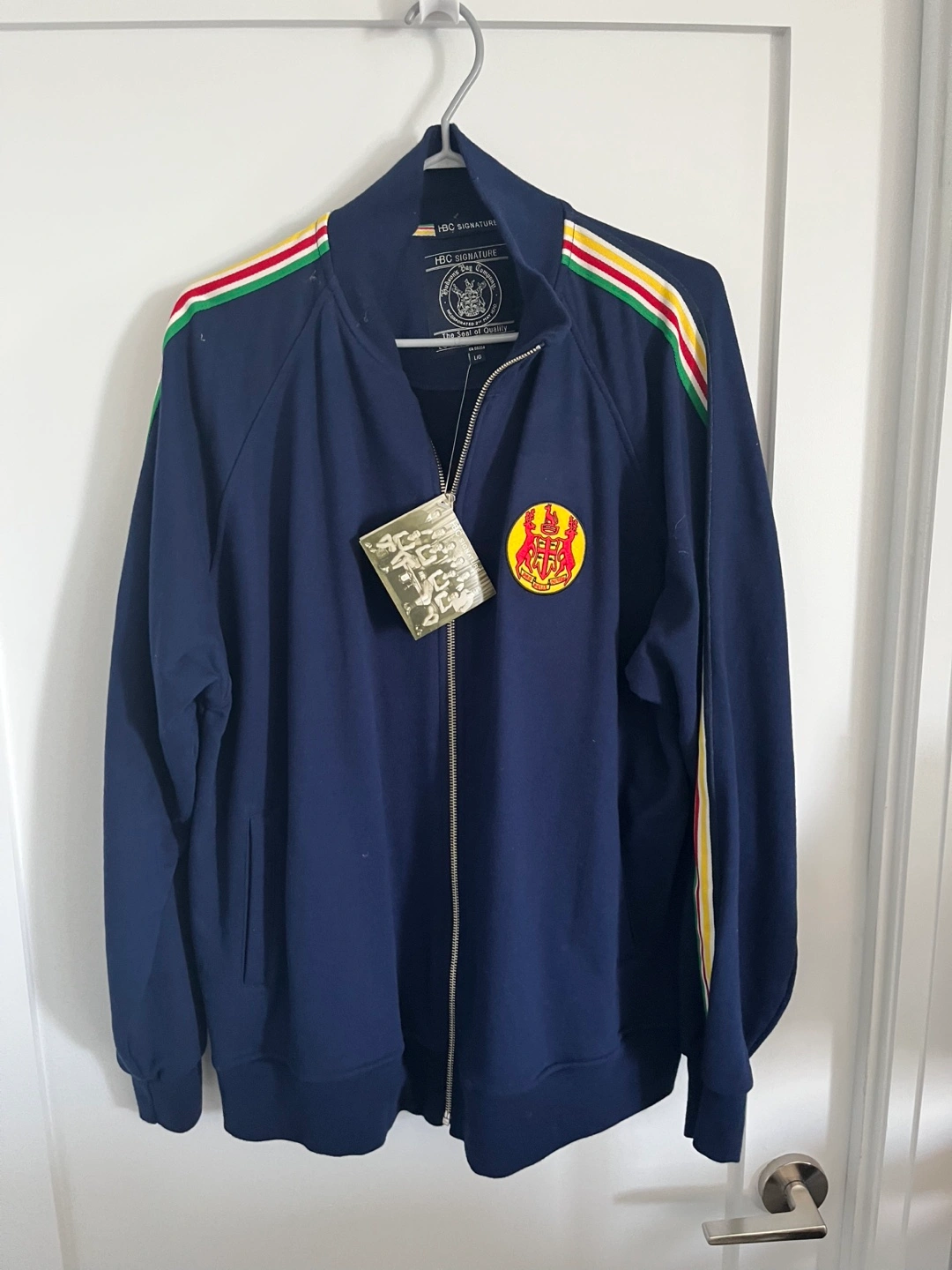 Track jacket, navy blue. Has a zipper closure. Features colourful stripes on the sleeves and back. Brand new. Why not own a piece of history!