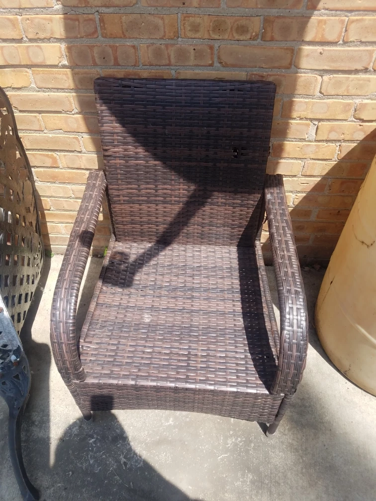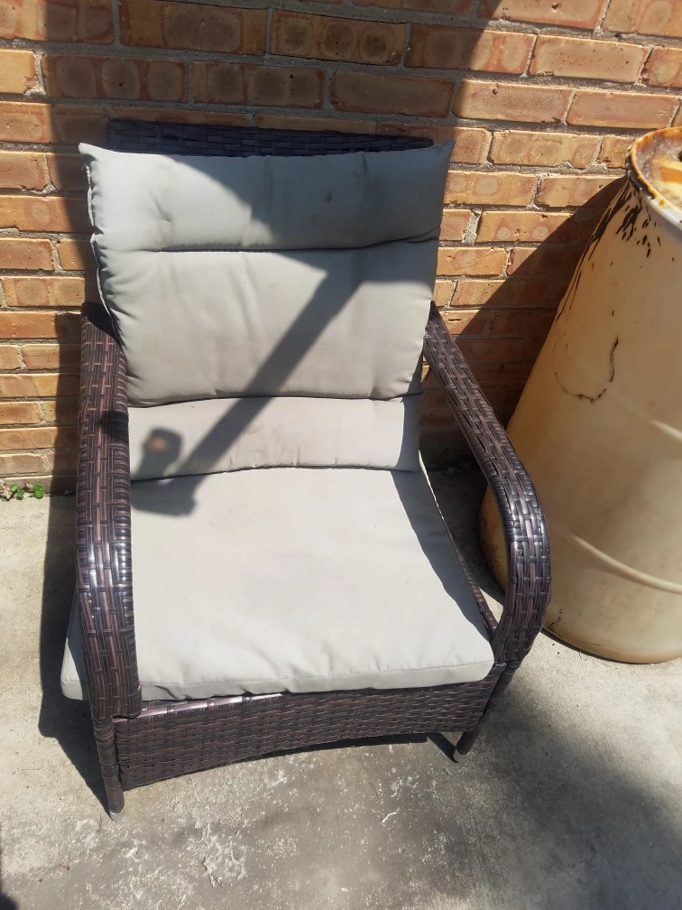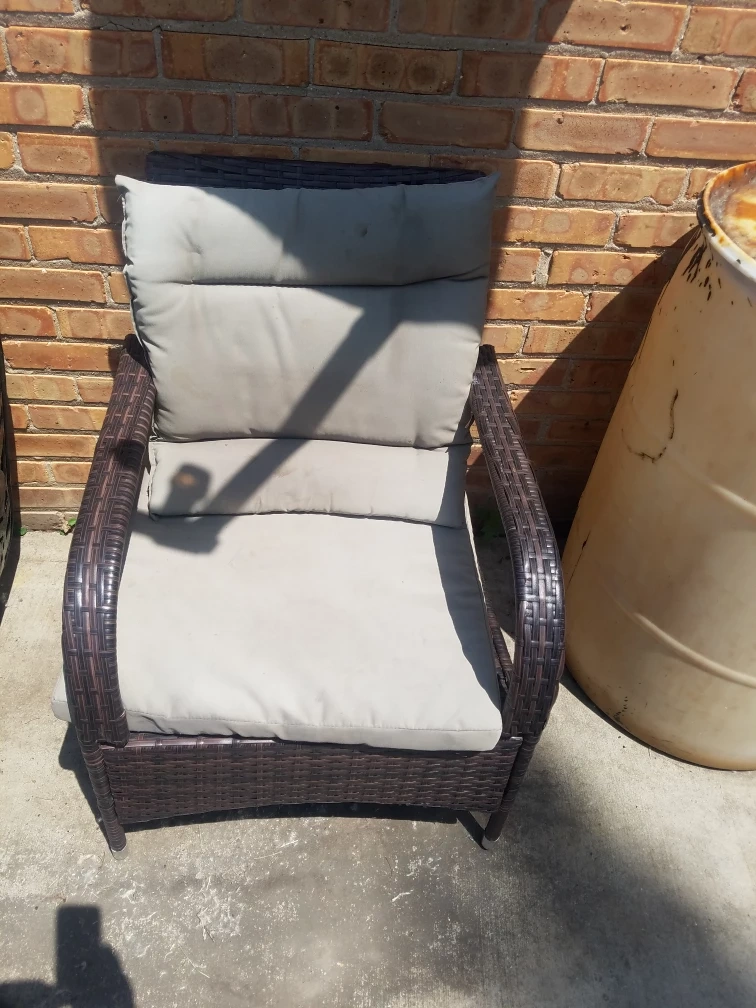 A brown wicker chair. Comes with cushions. Designed with armrests. A great place to relax and read your favorite book.
