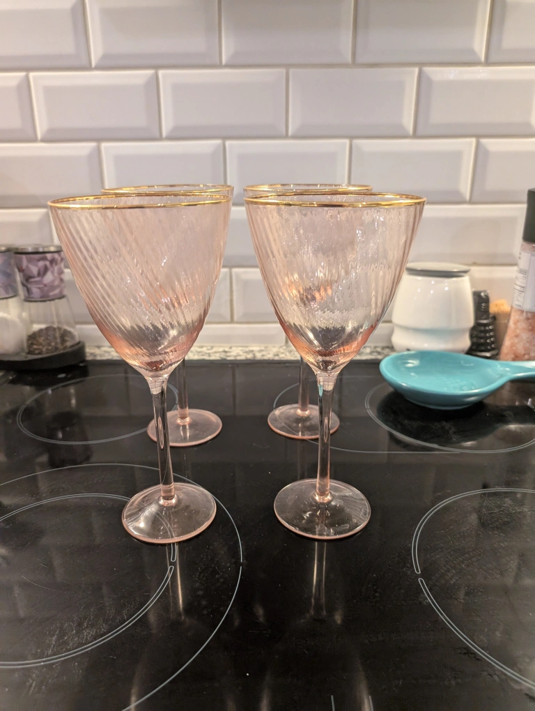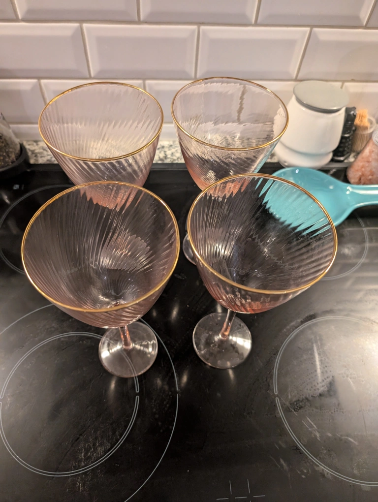 Beautiful set of four pink wine glasses, with a lovely gold rim. Made of lightweight glass, so not heavy even when full.