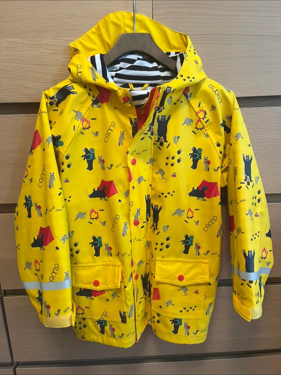 Bright yellow rain jacket. Features a hood, pockets, and a cute camp-themed pattern. Perfect for any outdoor adventure for your little ones.