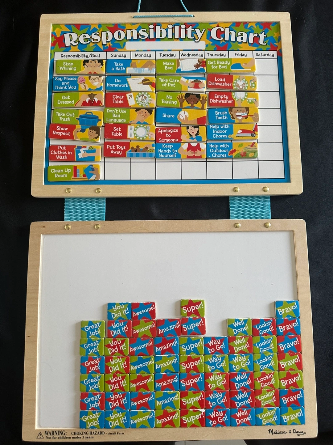 A responsibility chart, with reusable tiles. Includes both a chore chart, and reward tiles to be placed on the whiteboard. Creating a fun and educational experience is an easy way to teach responsibility. Pick up at O’Connor and parkview