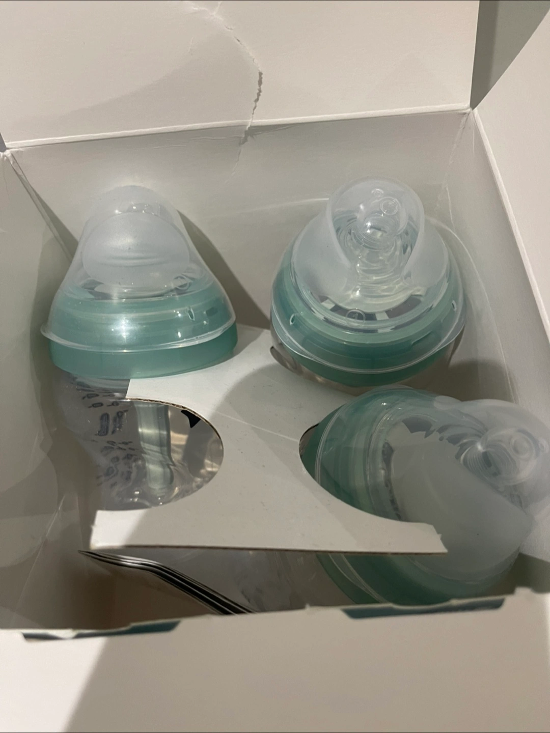 Open box, Tried the 1 bottle for my baby but he didn’t like it so we switch to different baby bottles..Three bottles is GUARANTEED DIDN’T USE. The bottles have a light blue/green ring. They are soft-looking, likely silicone