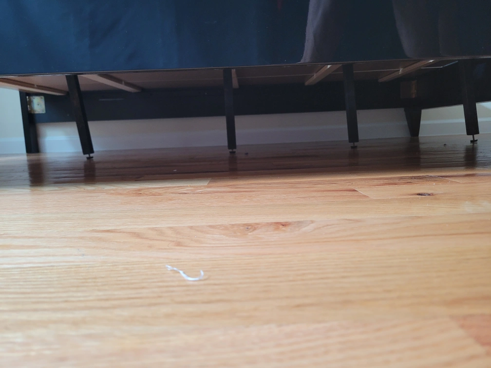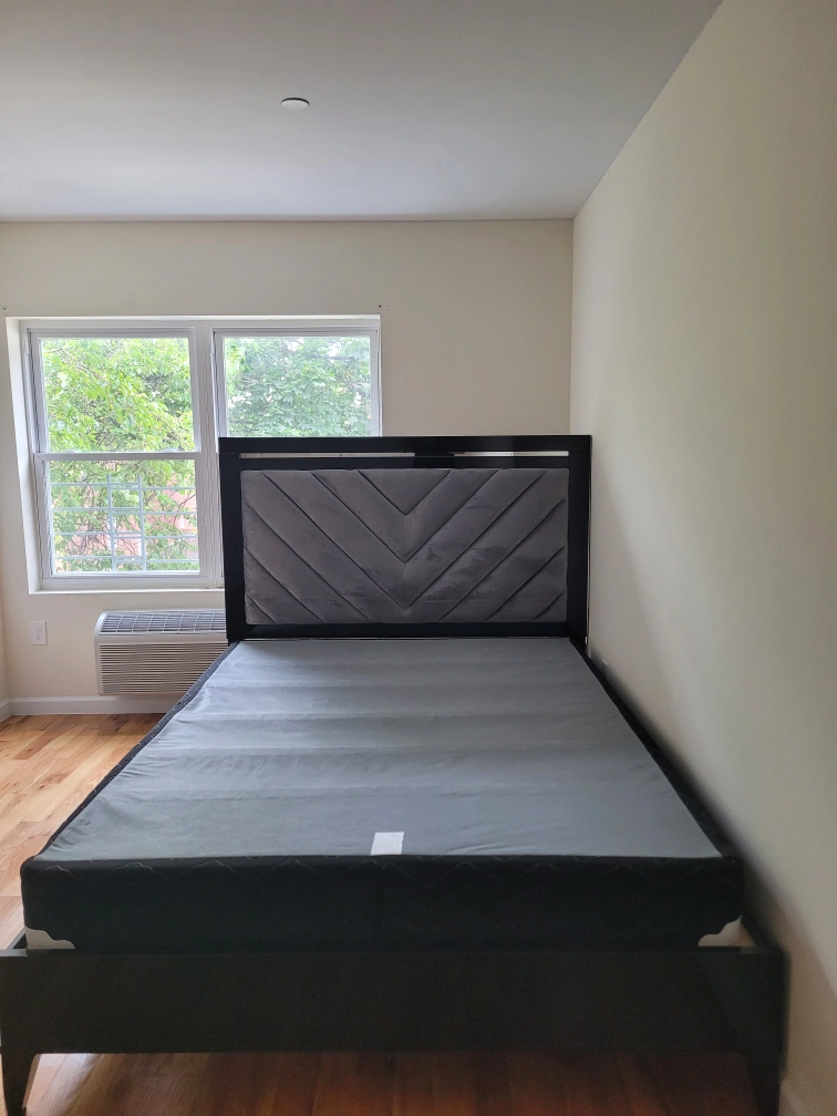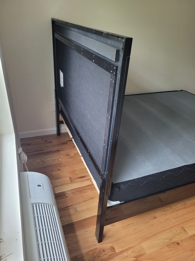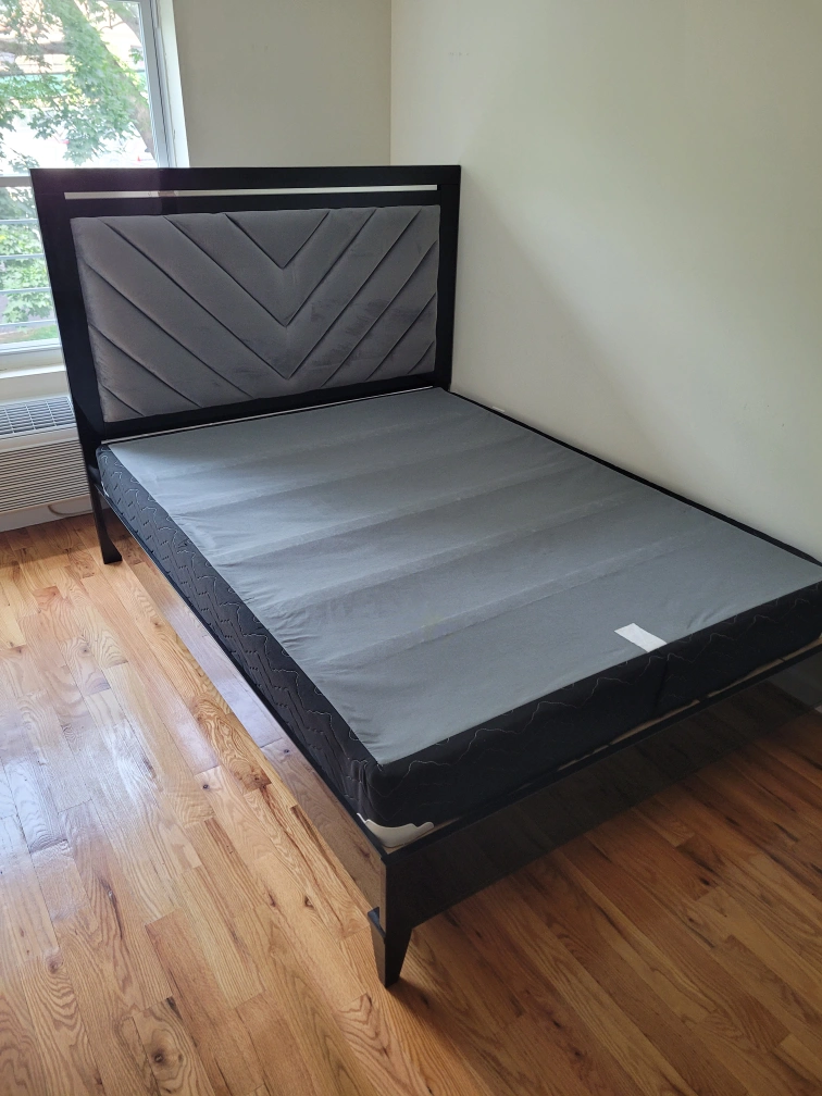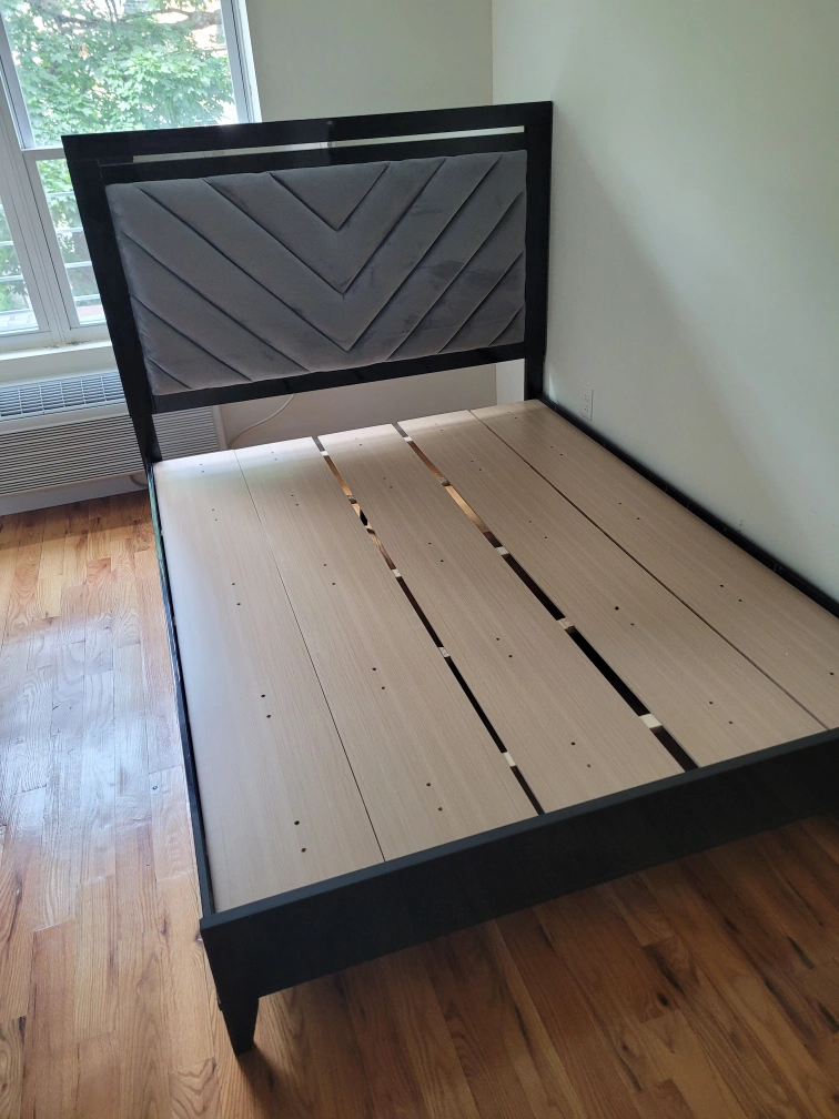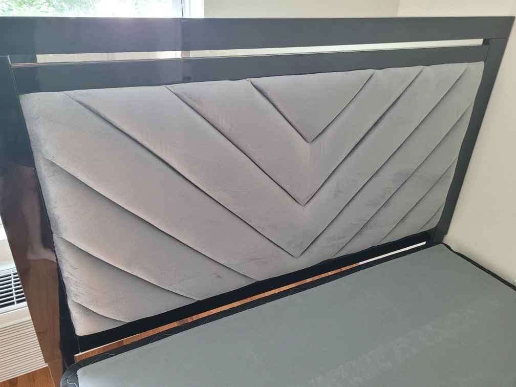 A beautiful queen-sized bed frame. Features a stylish upholstered headboard. Frame appears to be made of wood with a dark finish. A perfect bed to enjoy reading a book on, after a long day.