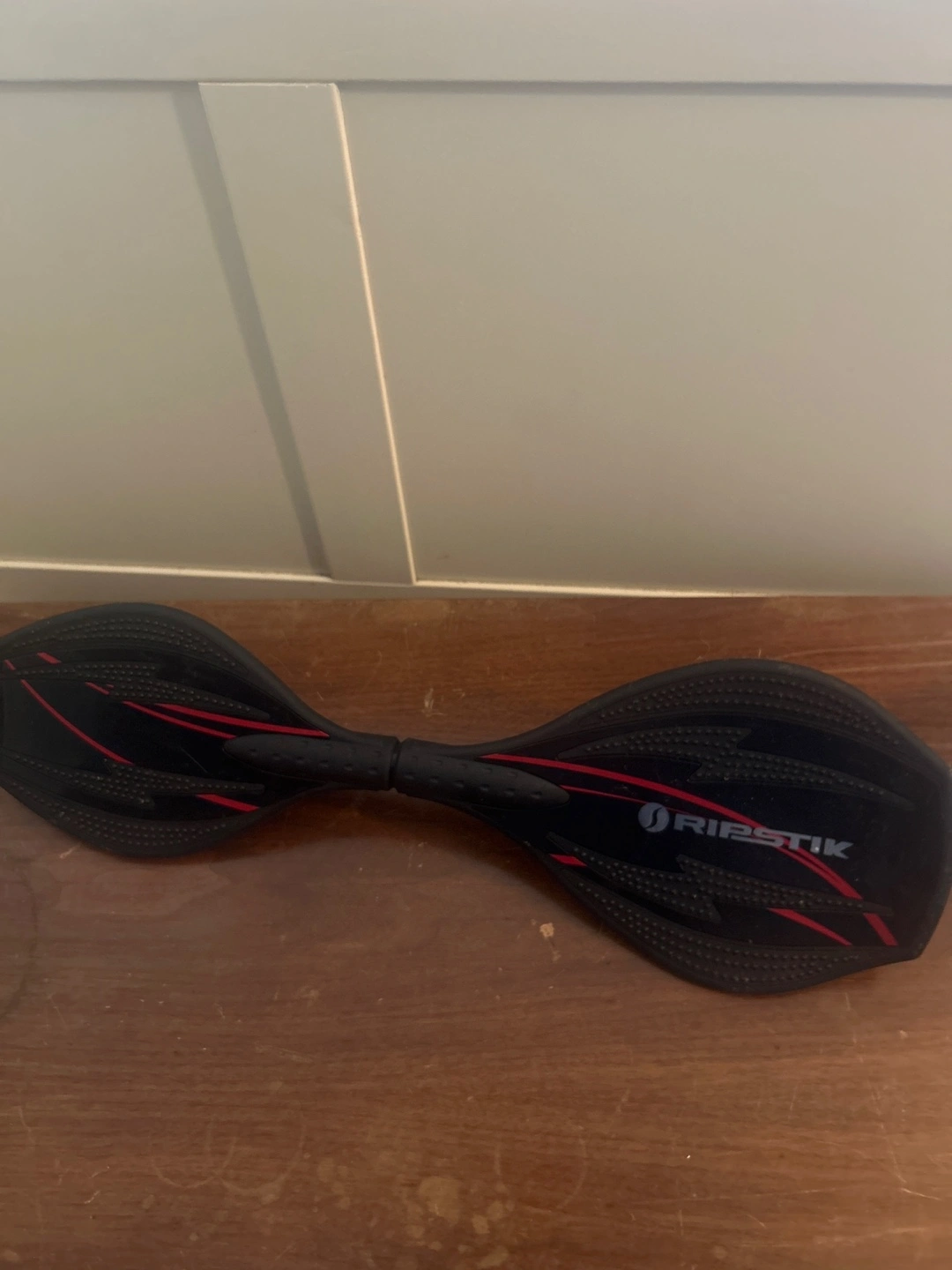 Black and red design, curved ends. The board is connected in the middle. The top surface has a textured pattern. A smooth ride is possible with this.