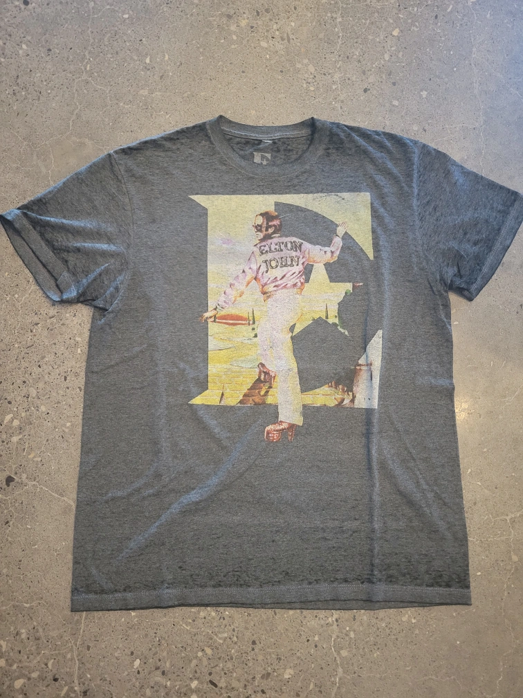 Grey coloured t-shirt with a graphic print of Elton John. Farewell tour dates printed on the back. You could wear this shirt while sitting at home, enjoying a nice glass of wine after a long day.