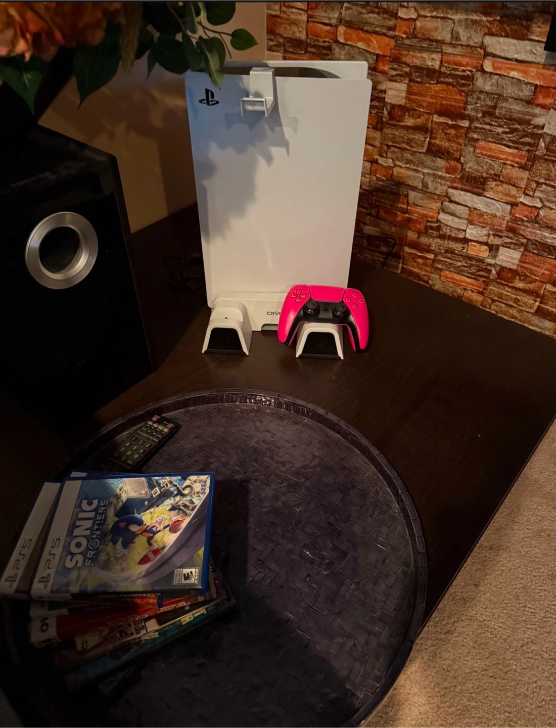 Includes a white PlayStation 5 console with a pink controller, a charging station and a selection of video games. This would be perfect for some relaxing downtime.