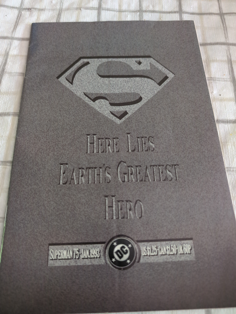 Mint condition. Jan. 1993. Features a Superman logo and the words "Here Lies Earth's Greatest Hero". The comic is gray in colour. A great read for a quiet night.