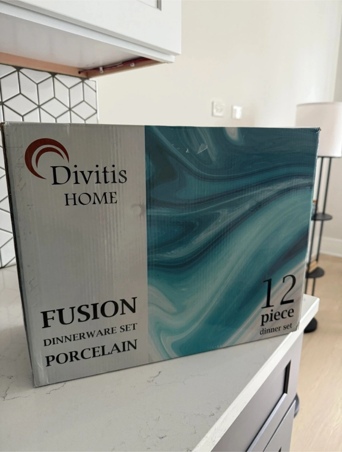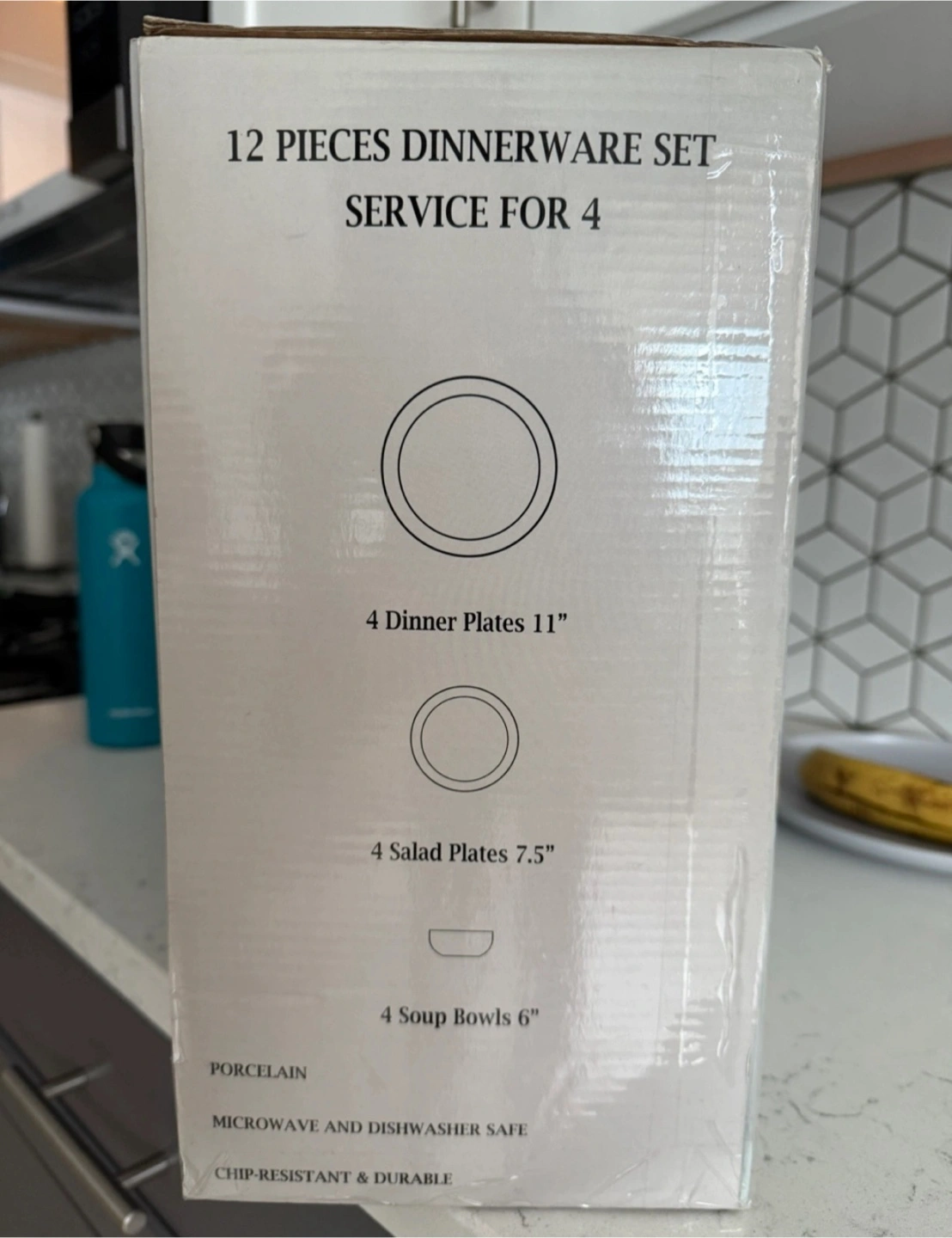 A complete dinnerware set. Contains plates and bowls. Great for hosting dinners with friends. The set is made of porcelain, and is microwave and dishwasher safe.
