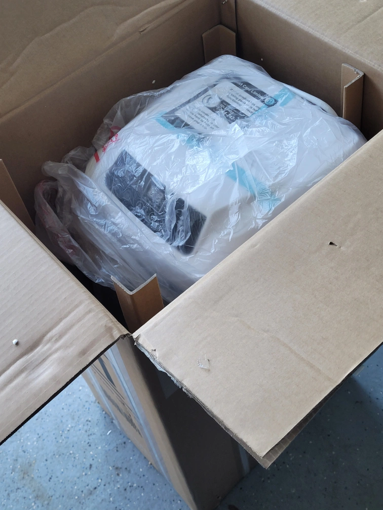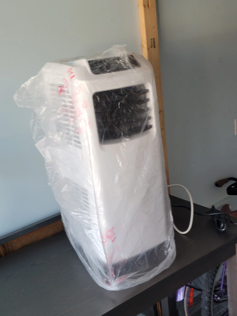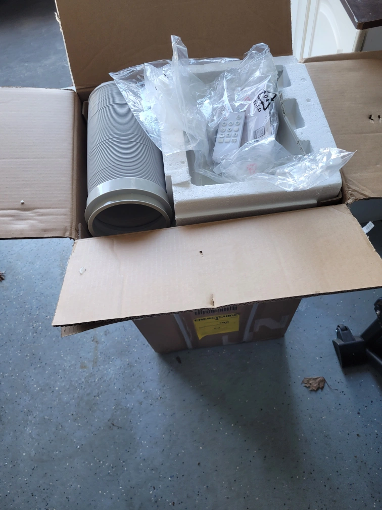 A white air conditioning unit. Includes a remote, tube, and other components. Comes with wheels for easy movement. The perfect addition to beat the summer heat and enjoy some fresh air. 9000 BTU.