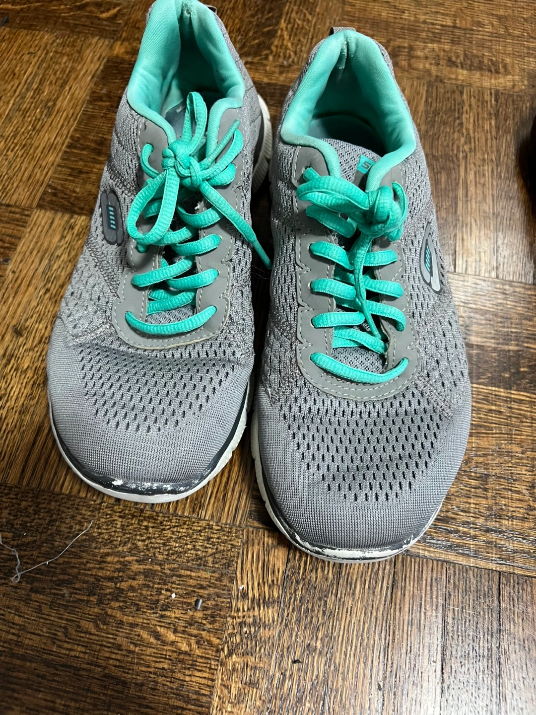 Athletic sneakers in a grey mesh material. Features turquoise laces and accents. They would be a great choice for a light morning walk.