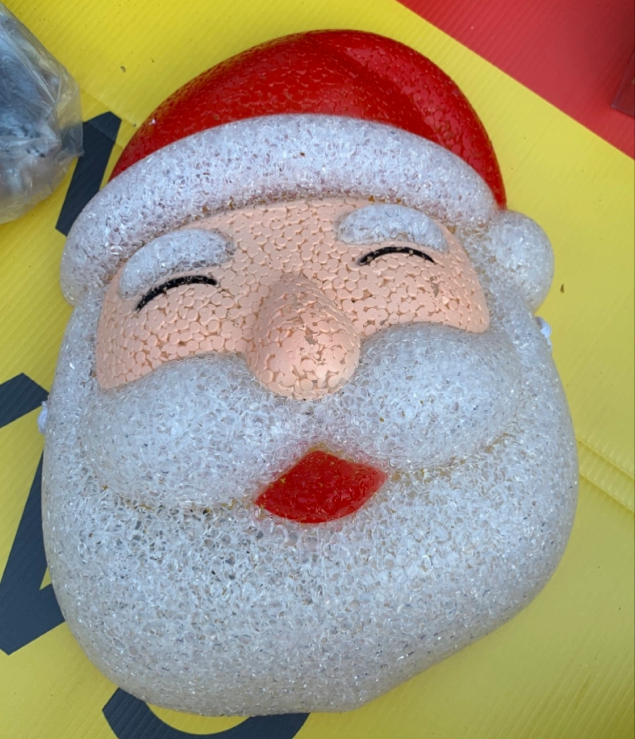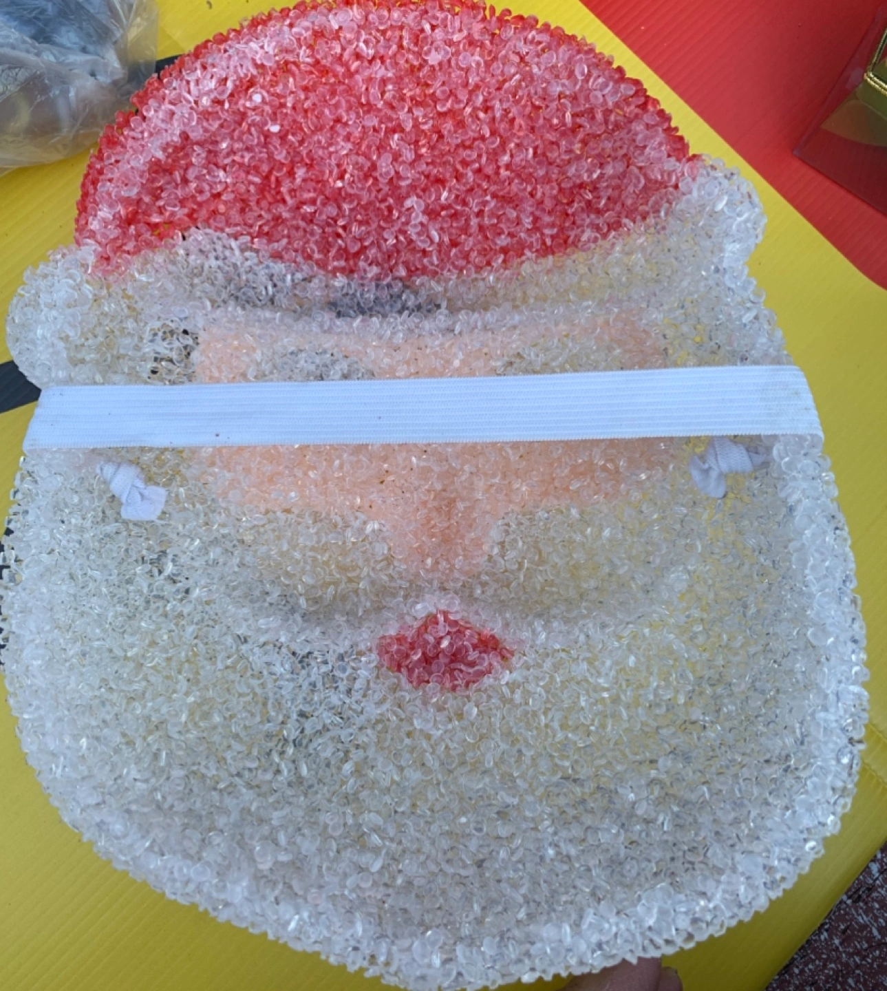 A Santa Claus mask. Features a red hat, a rosy nose and lips, and a fluffy white beard. The material appears to be made up of many small pieces of plastic. It would be perfect to wear during the holiday season to spread some cheer.