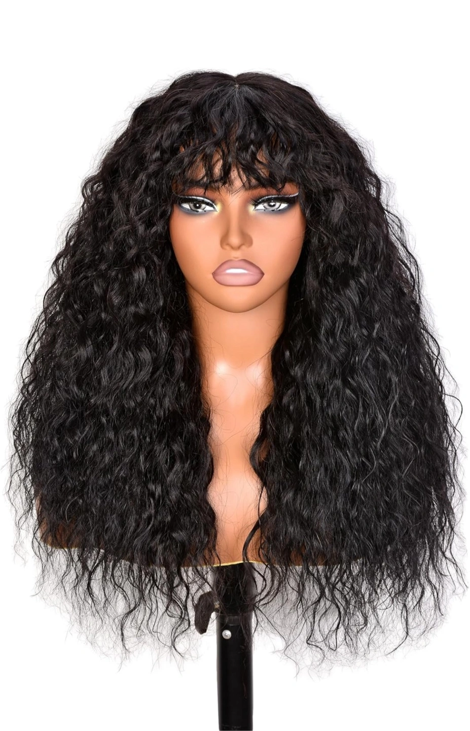 75Long, black, curly wig. Includes a small bang. Would be a great accessory for cosplaying or just to feel yourself.
