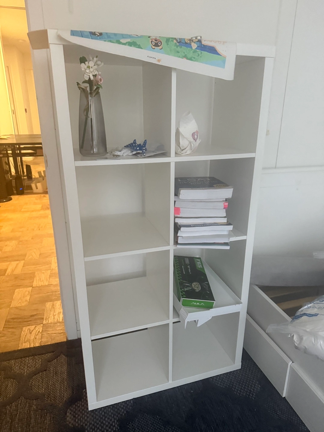 Selling a white 8-cube bookshelf—perfect for books, storage bins, decor, or organizing any room. Simple modern design and fits well in bedrooms, offices, or living rooms.