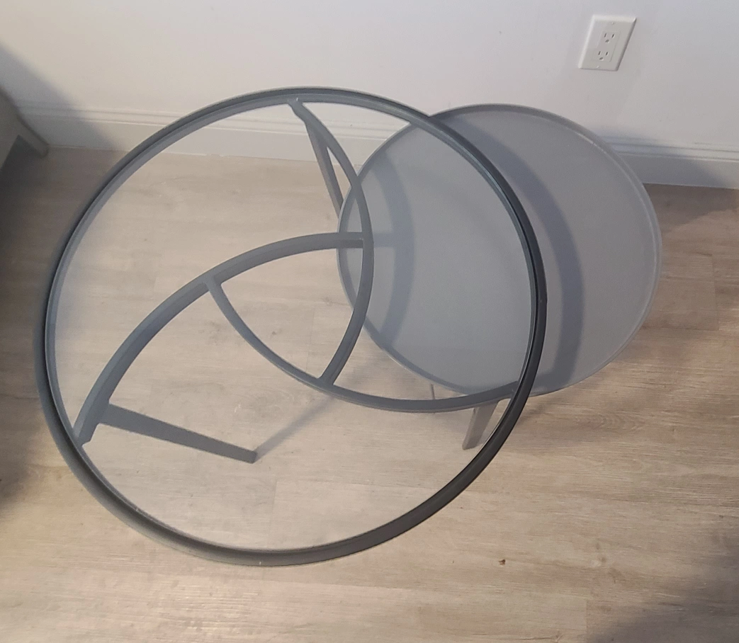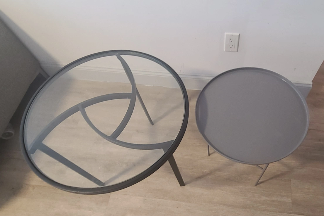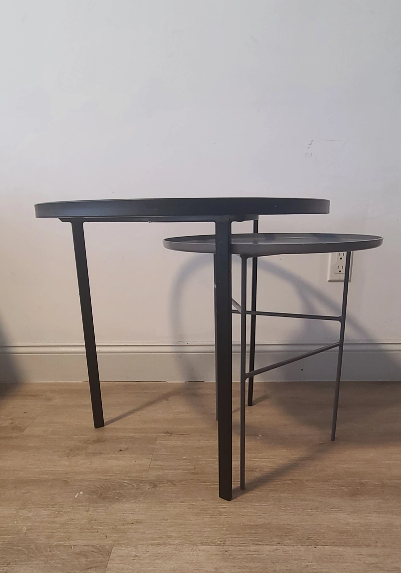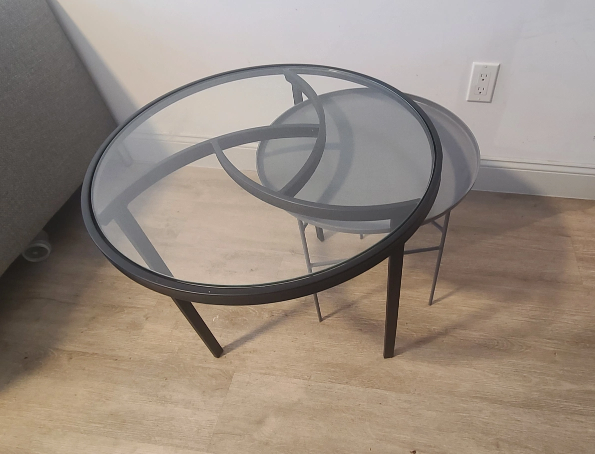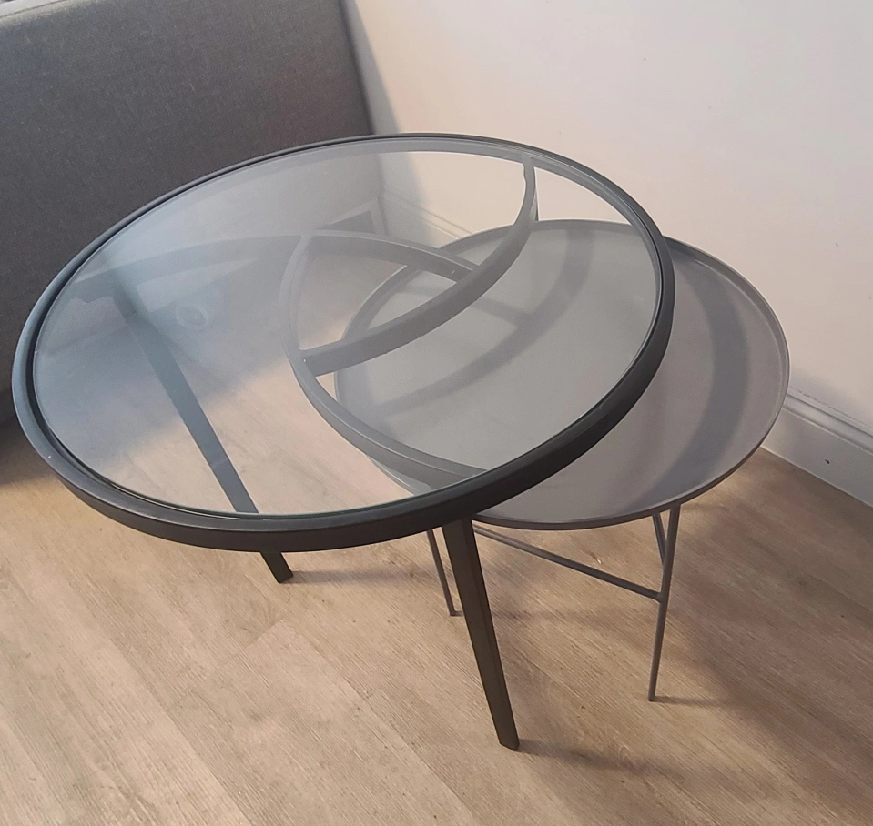 A two-piece nesting coffee table set. The larger table has a clear glass top. The metal frame of the large table is in a dark color. The smaller table has a solid gray top. It will be the perfect addition to your living room for relaxing with a book.