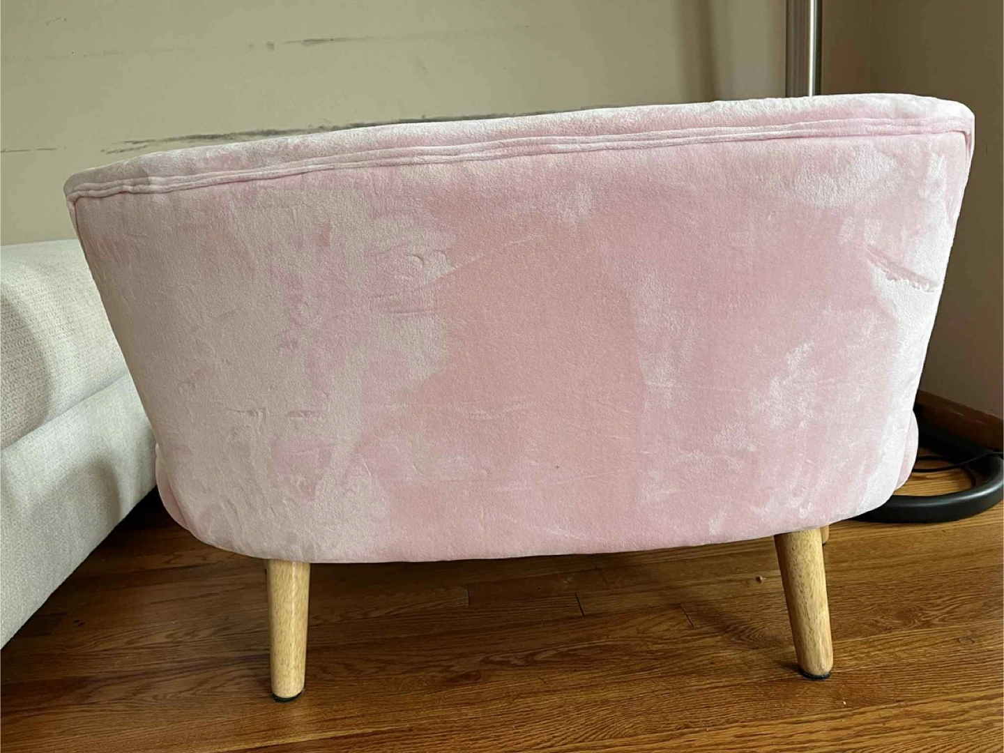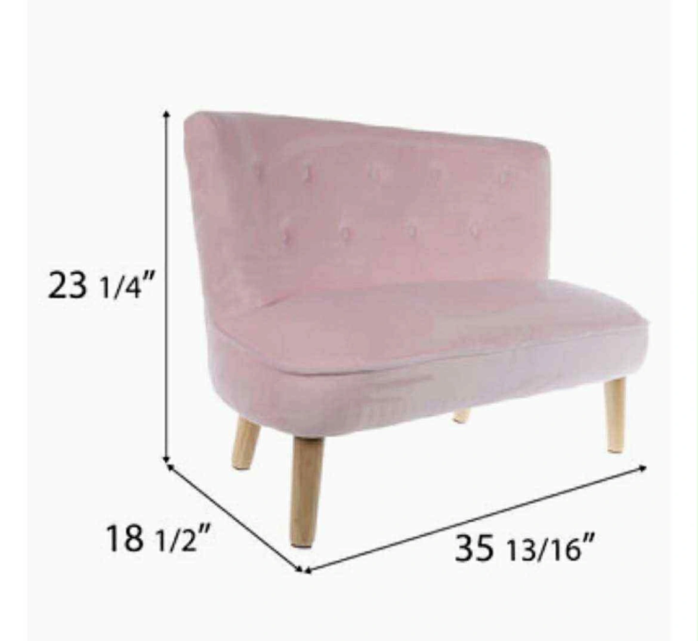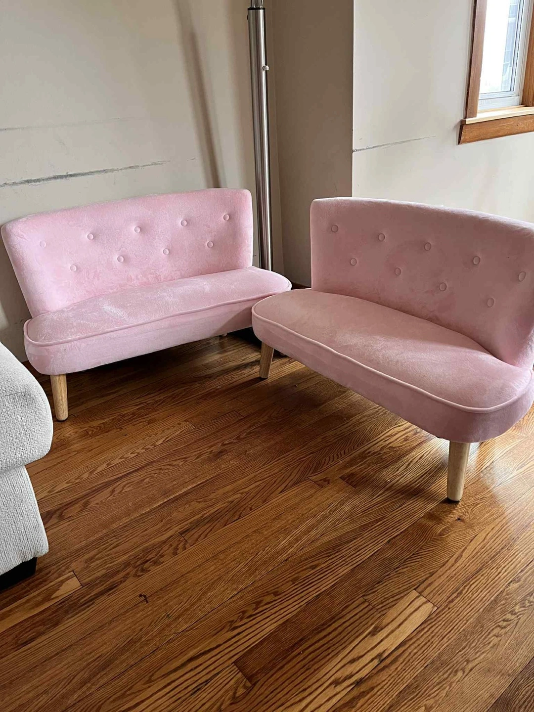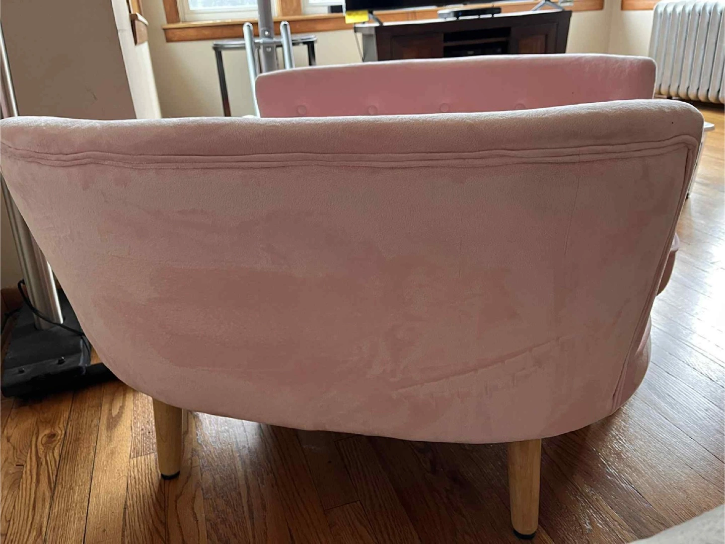 Pretty pink loveseat. Features curved design. Wooden legs. Perfect for lounging and relaxing after a long day. $75 each..