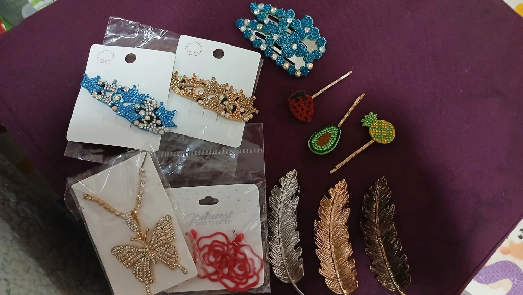 You could feel so calm when getting ready with these lovely pieces. Included are hair clips with blue and gold rhinestones, various hair pins with fruits and feather designs, a butterfly pendant necklace, and some earrings.