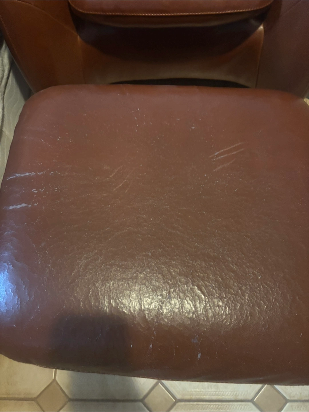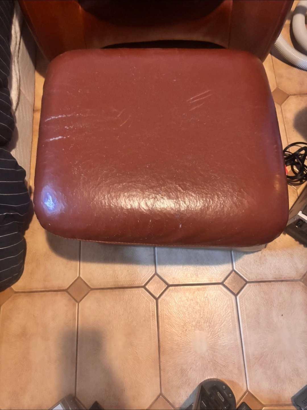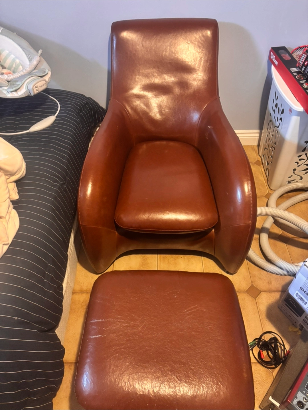 An armchair with matching ottoman. Brown leather upholstery. Curved arms and back. The ottoman is square and matches the chair. It's perfect for a relaxing evening after a long day.