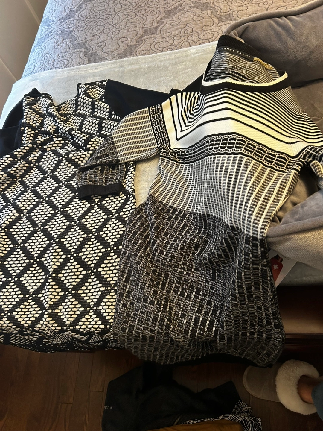 A collection of various clothing items in various sizes and styles. Includes knit sweaters, dresses, pants shorts, blouses and more.