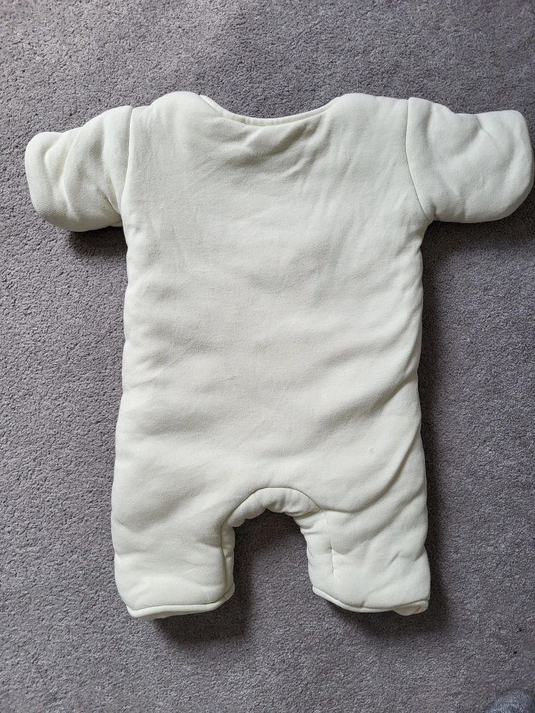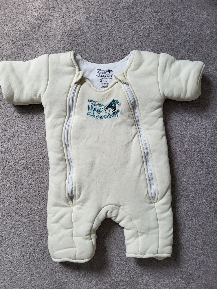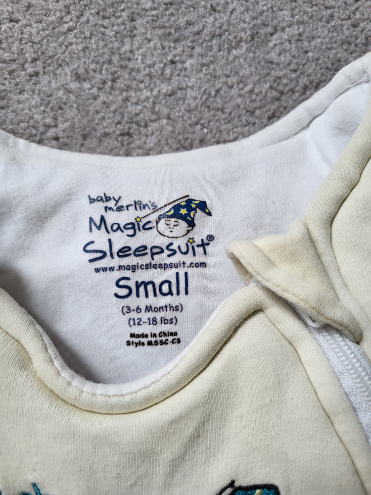 Beige magic merlin sleepsuit, size small (3-6 months). In great used condition, no stains. See last picture for very minor flaw in fabric on the back, does not impact function.