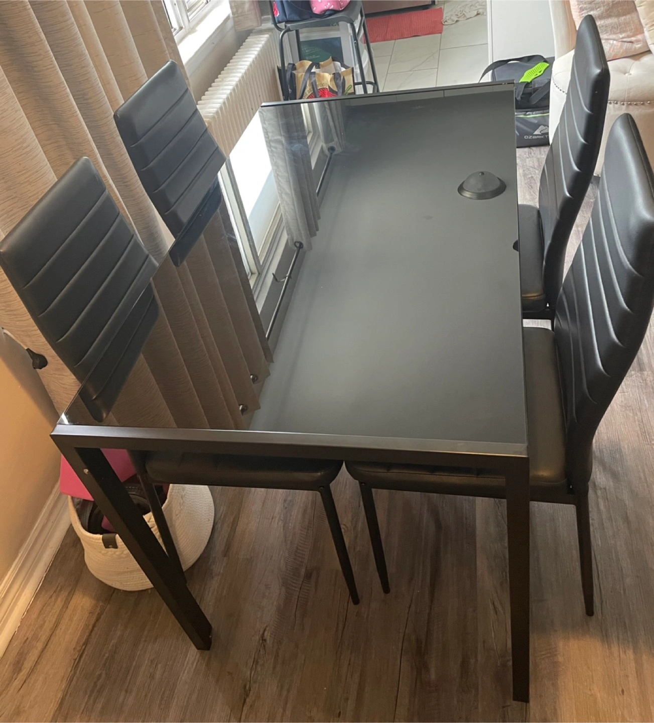This set has a rectangular table. The table has a black, glass top. Four chairs with black, cushioned seats and backs. Imagine having warm and comforting meals with friends and family at this table.