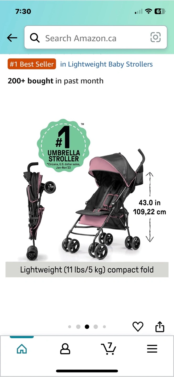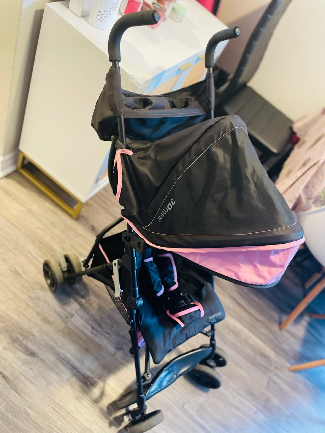 A lightweight stroller with a black frame. Features a black seat with pink accents. Has a sunshade. This stroller is a good way to make your child feel secure when on the move.