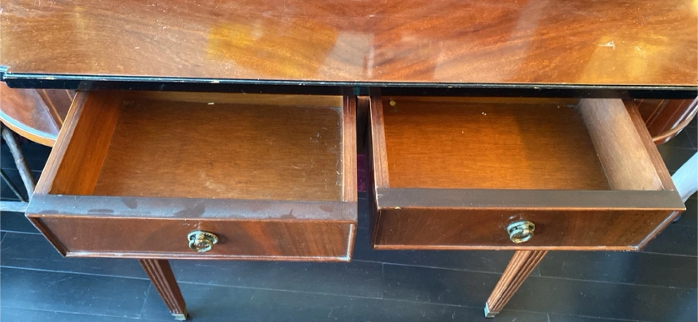 A wooden console table. It features a half-moon shape. There are two drawers with decorative knobs. 45” long, 11” deep and 31” height.