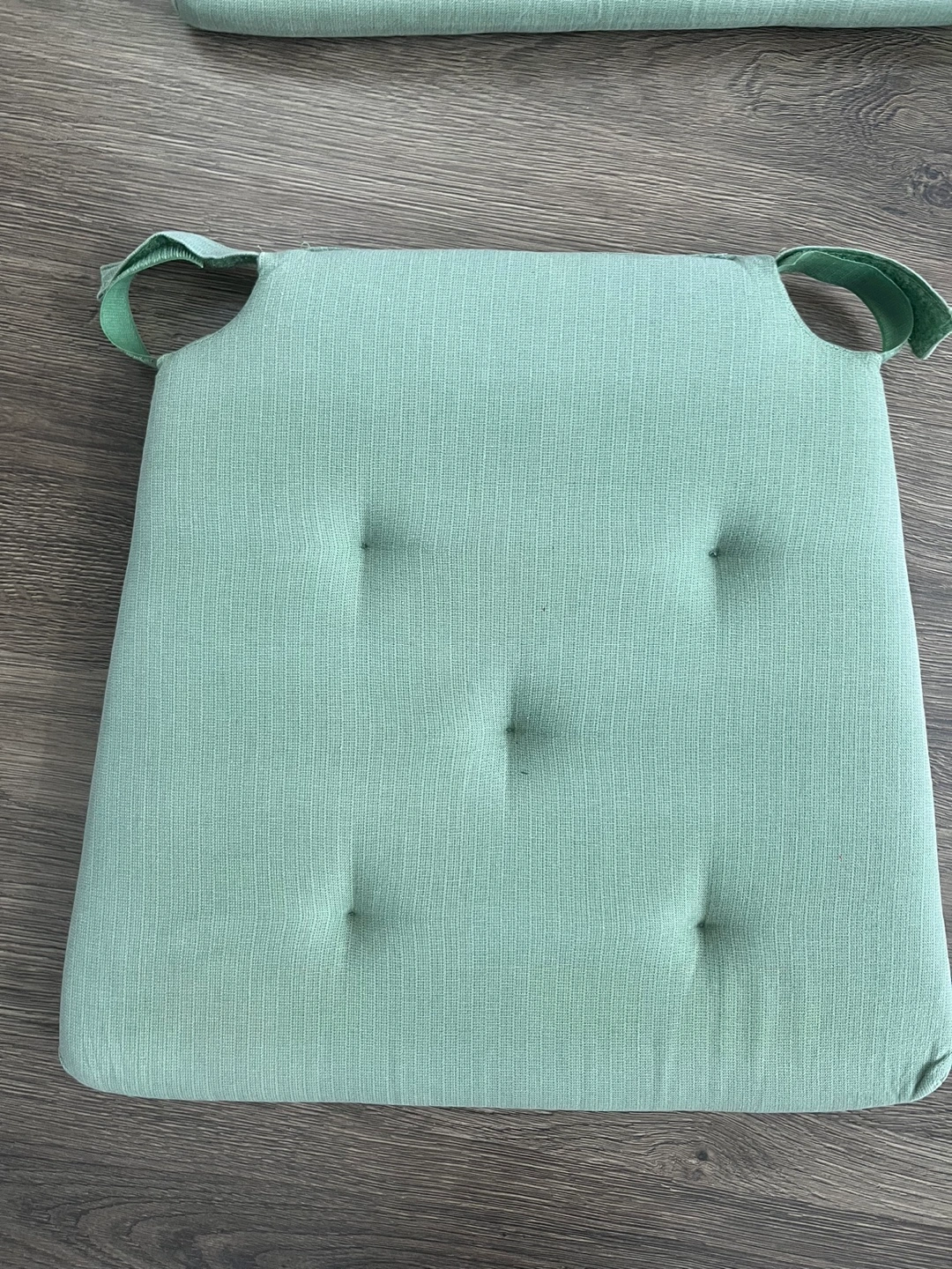 Soft green seat cushions, perfect for adding comfort to chairs. With a few clicks, you'll have the added support you need. Square-shaped with button details, and loop ties attached on the sides.