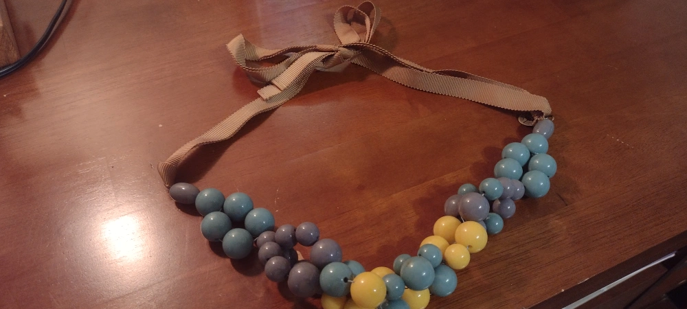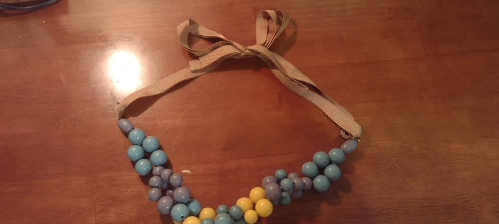 A unique necklace with a ribbon tie closure. Features varying sizes of beads. Colors include shades of blue, gray, and yellow. It's a great accessory for everyday wear, adding a touch of charm to any outfit.
