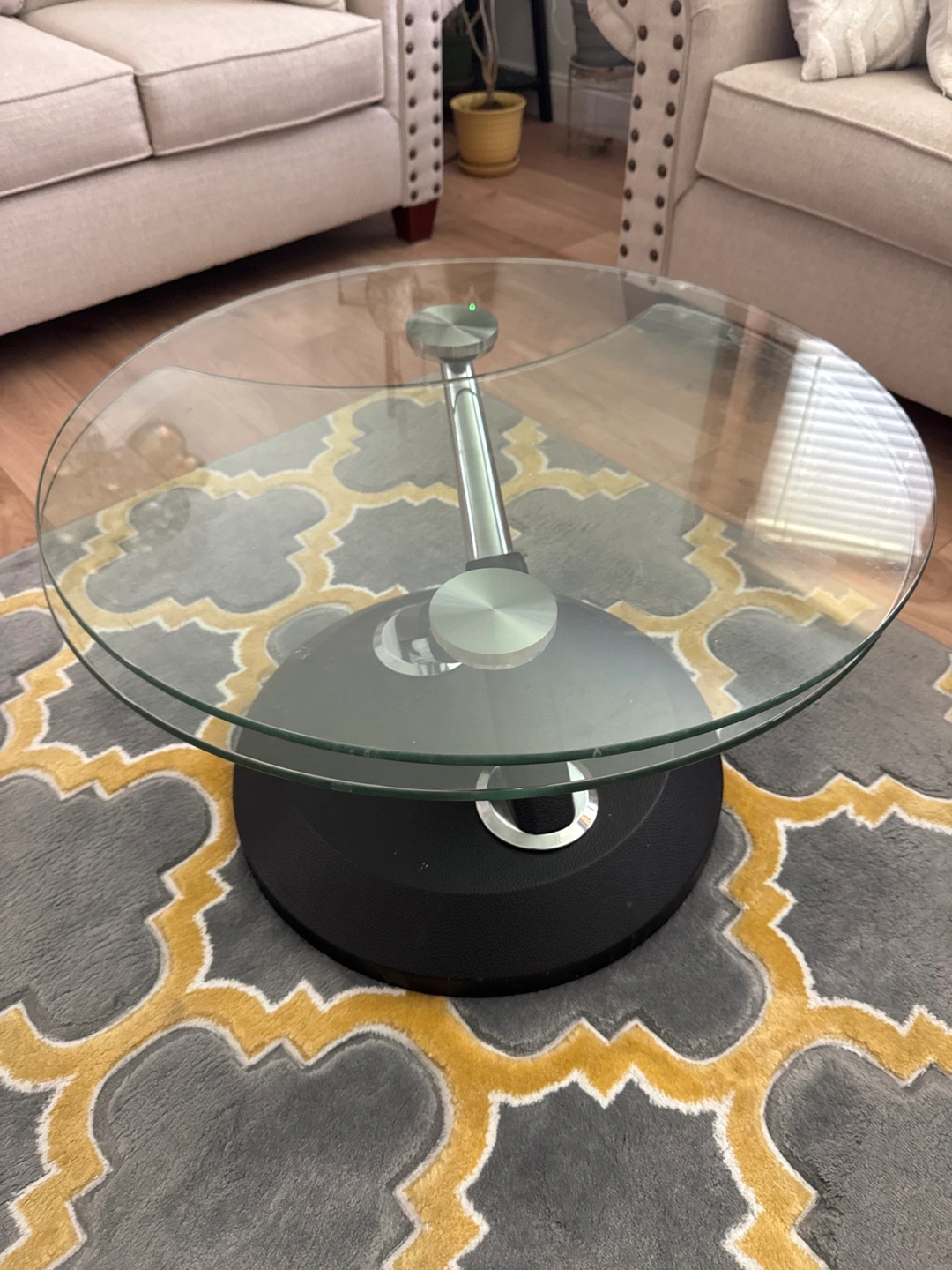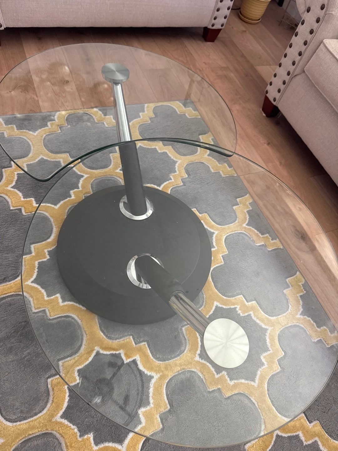 A stunning modern coffee table. Features a round glass top. It has a silver metal support and a circular base. The perfect table for your living room, where you can peacefully enjoy your favorite books and beverages.