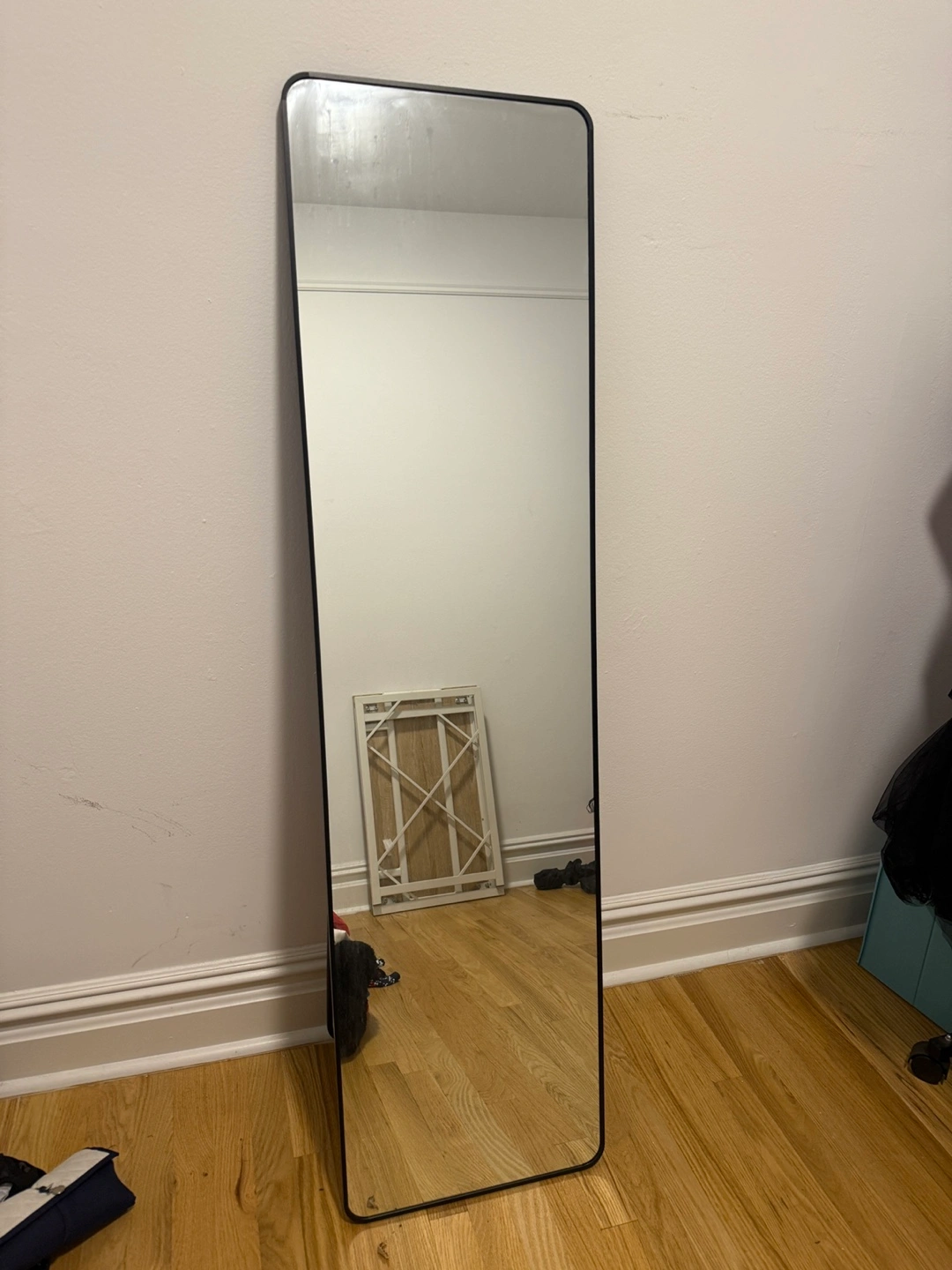 A tall, rectangular mirror with a black frame. It has rounded corners. The mirror looks clean. Placing this mirror in your bedroom will help you feel at peace before starting your day.