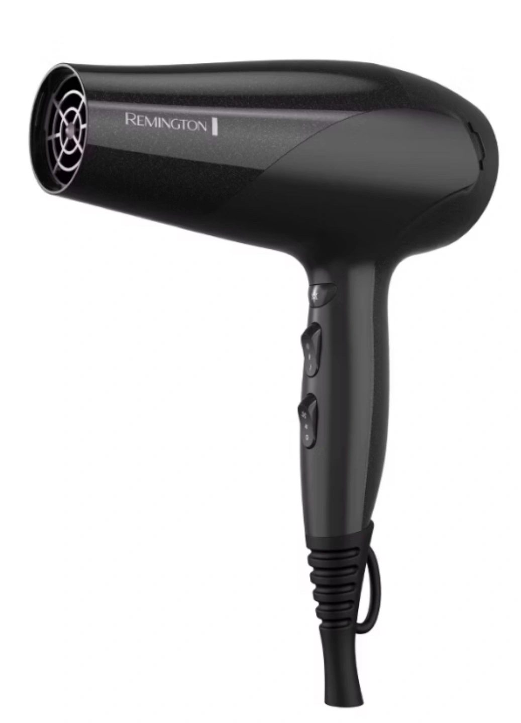 Black hair dryer. Has an ergonomic handle. Offers different settings for heat and speed. Use it to get ready for the day and feel at peace.