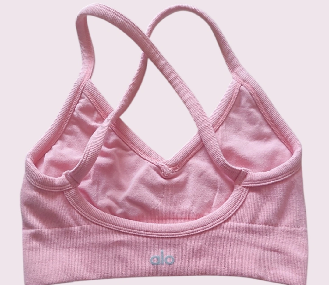 Light pink sports bra. Features a criss-cross back. The bra is ribbed and appears to be soft. You could use this for some light yoga sessions.