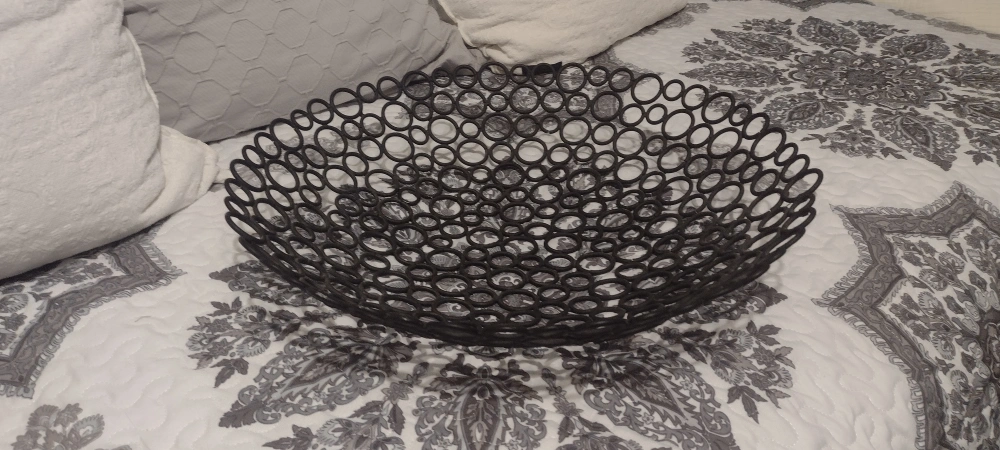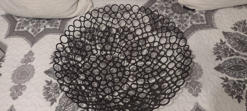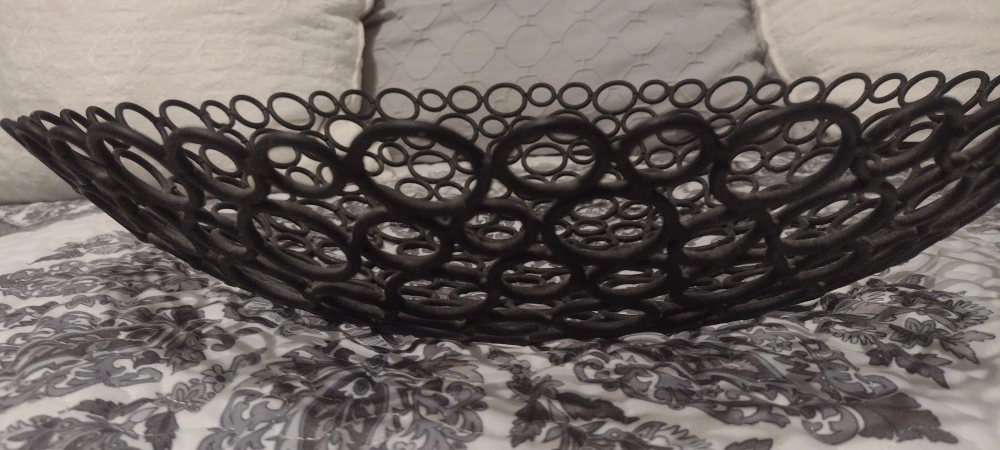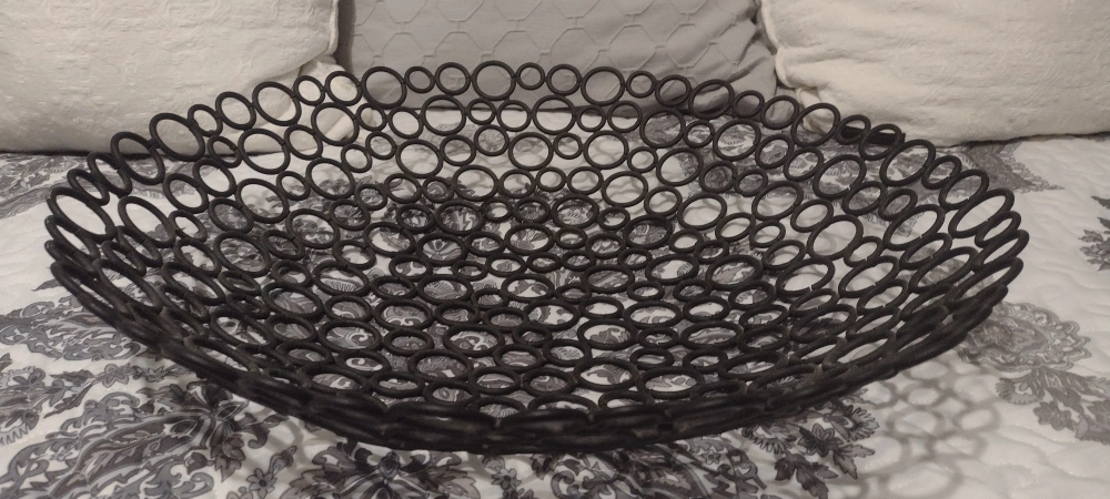 The bowl is crafted from a dark metal. It is circular in shape, with a series of connected circles. This is the perfect bowl to add a touch of elegance to your table, or even hung on a wall.