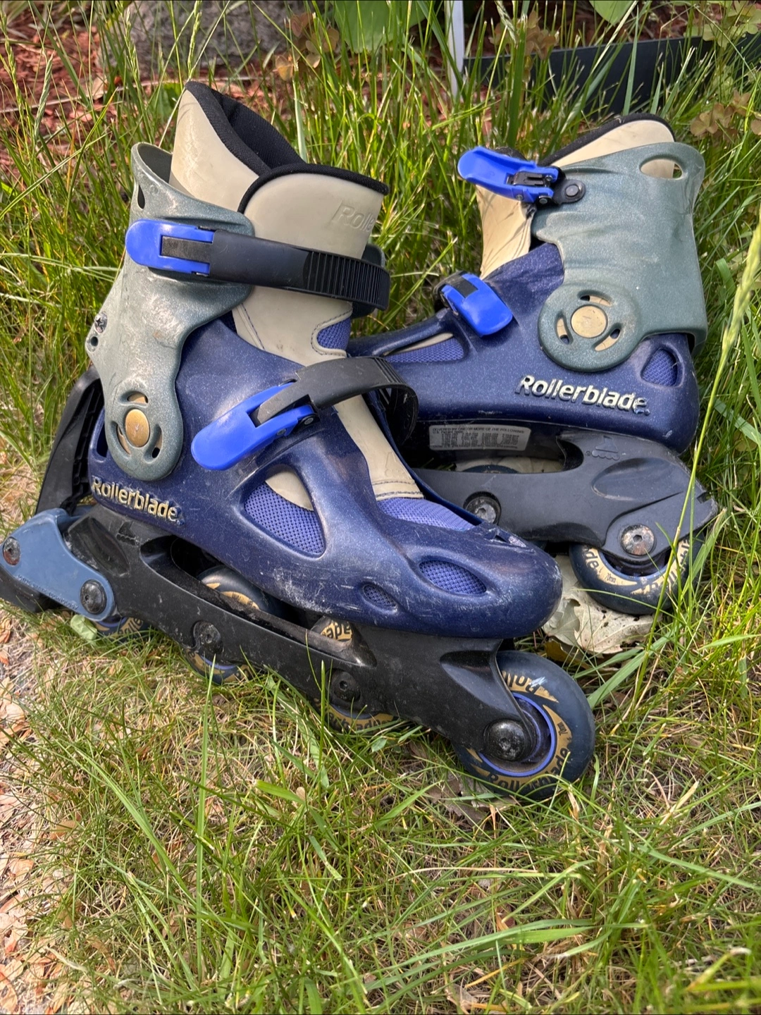 Official brand name Rollerblades size 7.5 Dark blue rollerblades. Grey and blue buckles. Black wheels. Enjoy the sensation of gliding along on a sunny day.