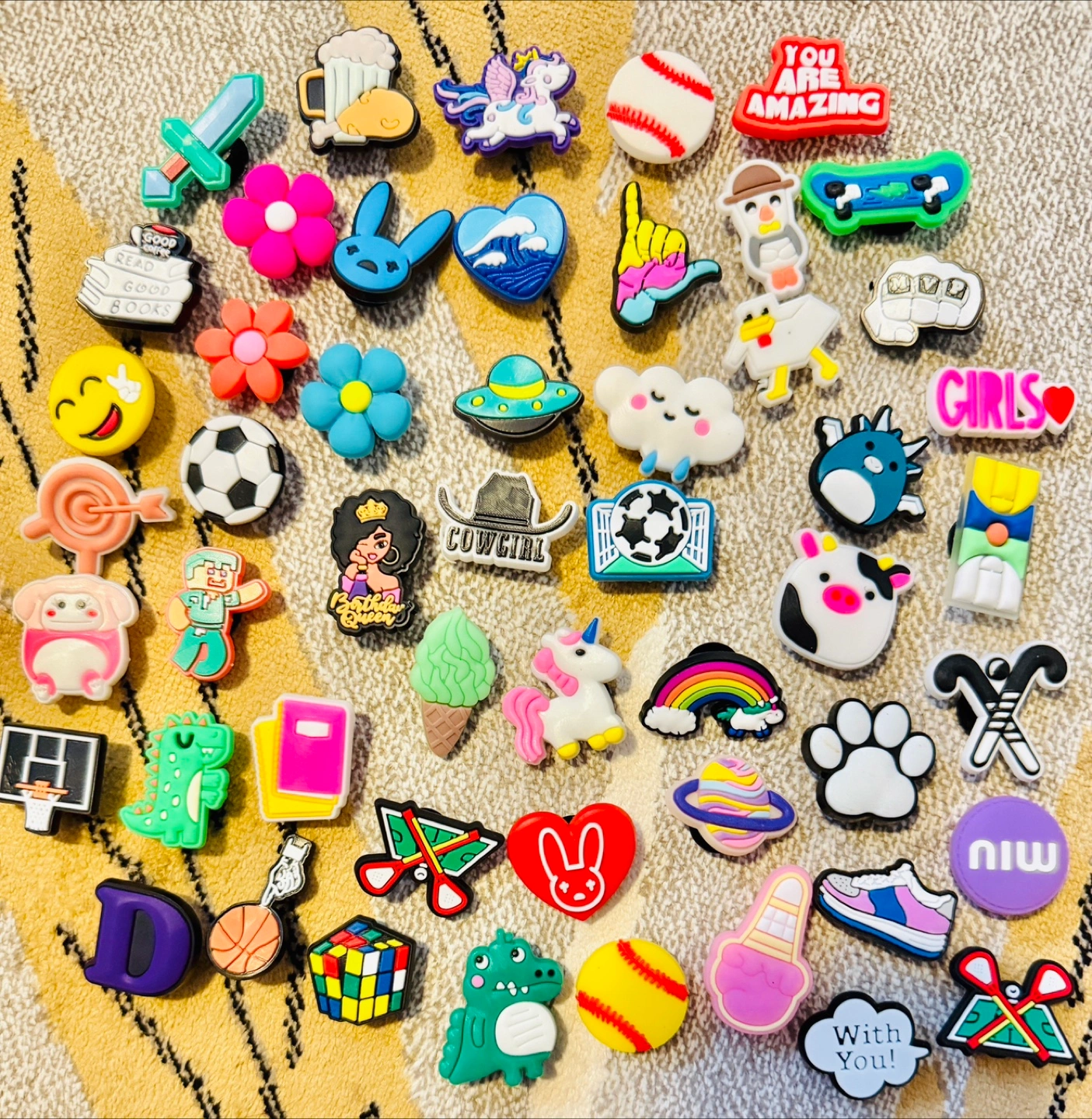 A diverse collection of decorative shoe charms. It includes various shapes and designs, which are great for personalizing footwear. Take a deep breath and relax while arranging these fun charms to your liking. If you get 10 then it would be $3 so there is a good discount for buying more