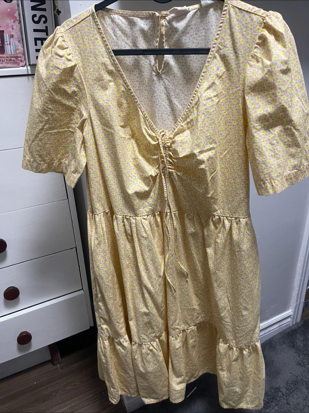 A sweet floral dress, featuring a v-neckline. Comes with short sleeves and a drawstring design. A perfect addition to any wardrobe