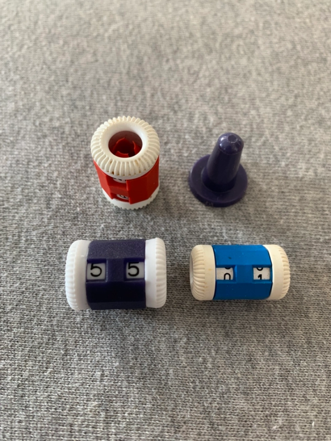Set of knitting row counters in various colours. Each piece is made of plastic. Light blue one is slightly smaller than the other 2.