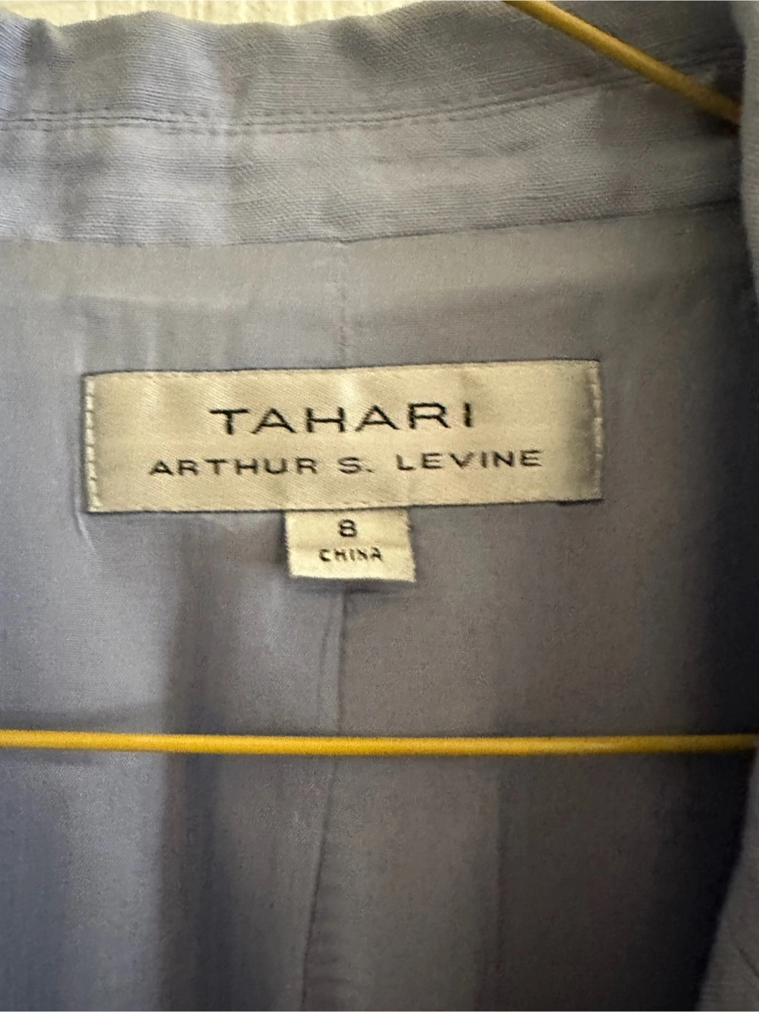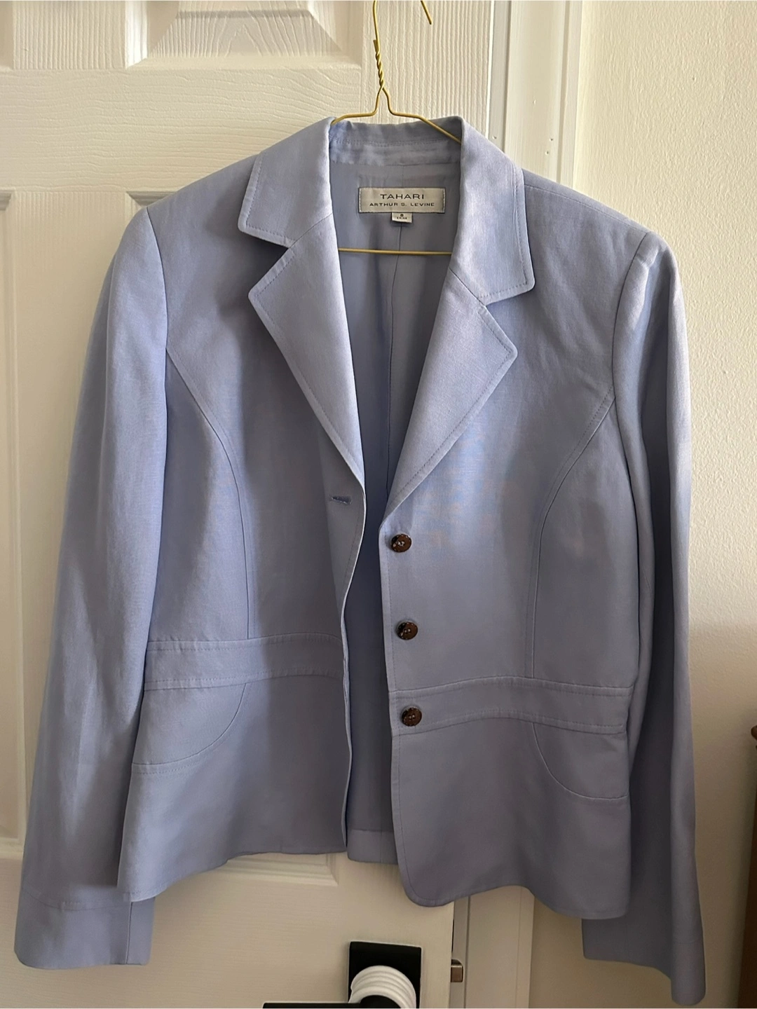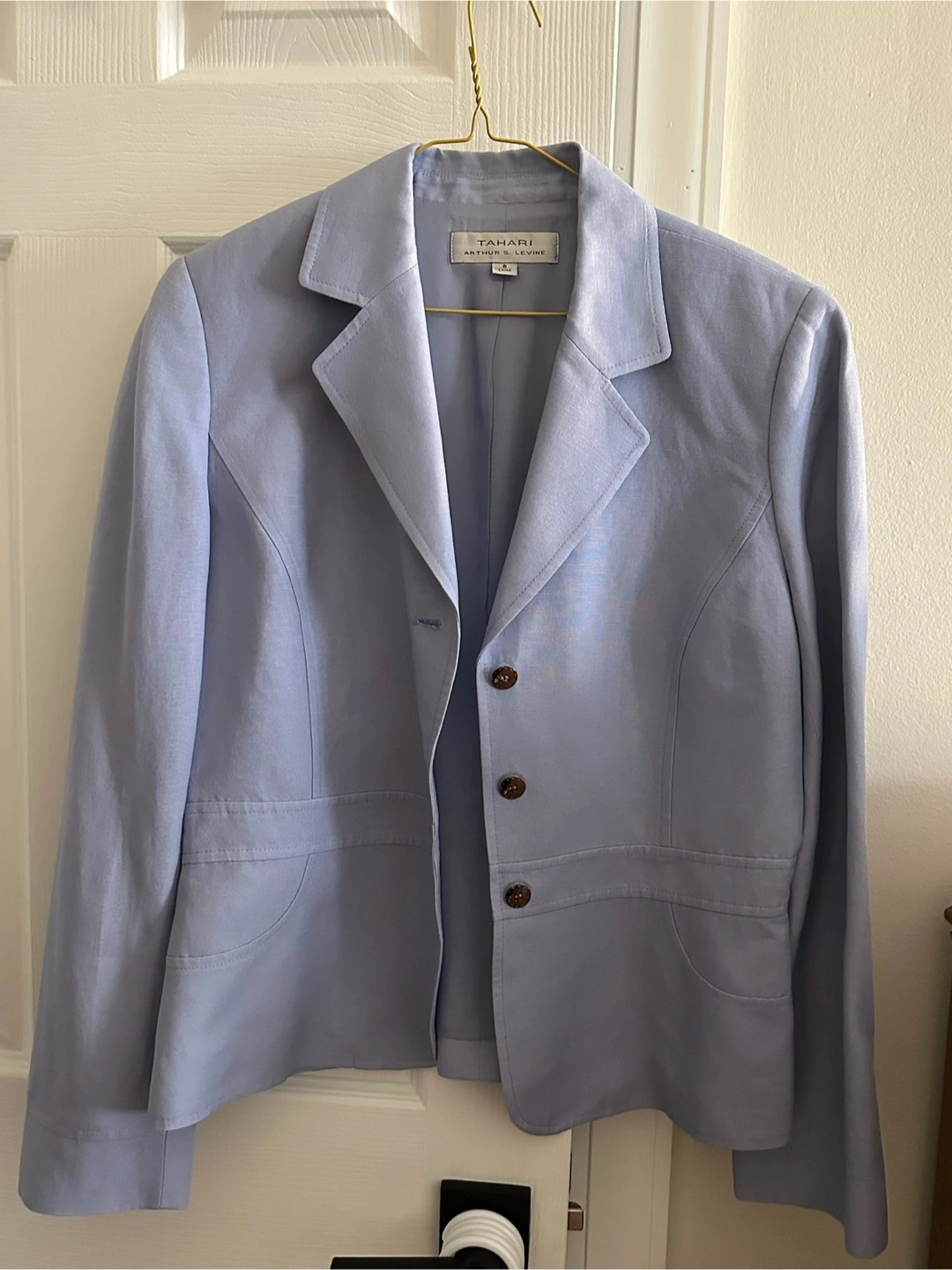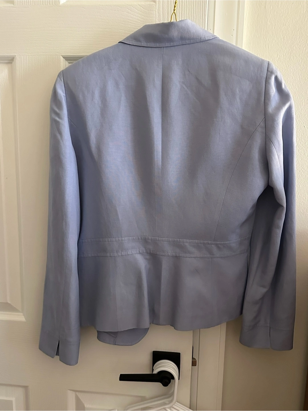 Stylish blazer in a soft light blue/purple color. Features a notched lapel and front pockets. Three button closure. The perfect blazer for a business meeting.
