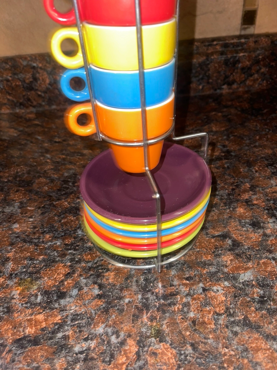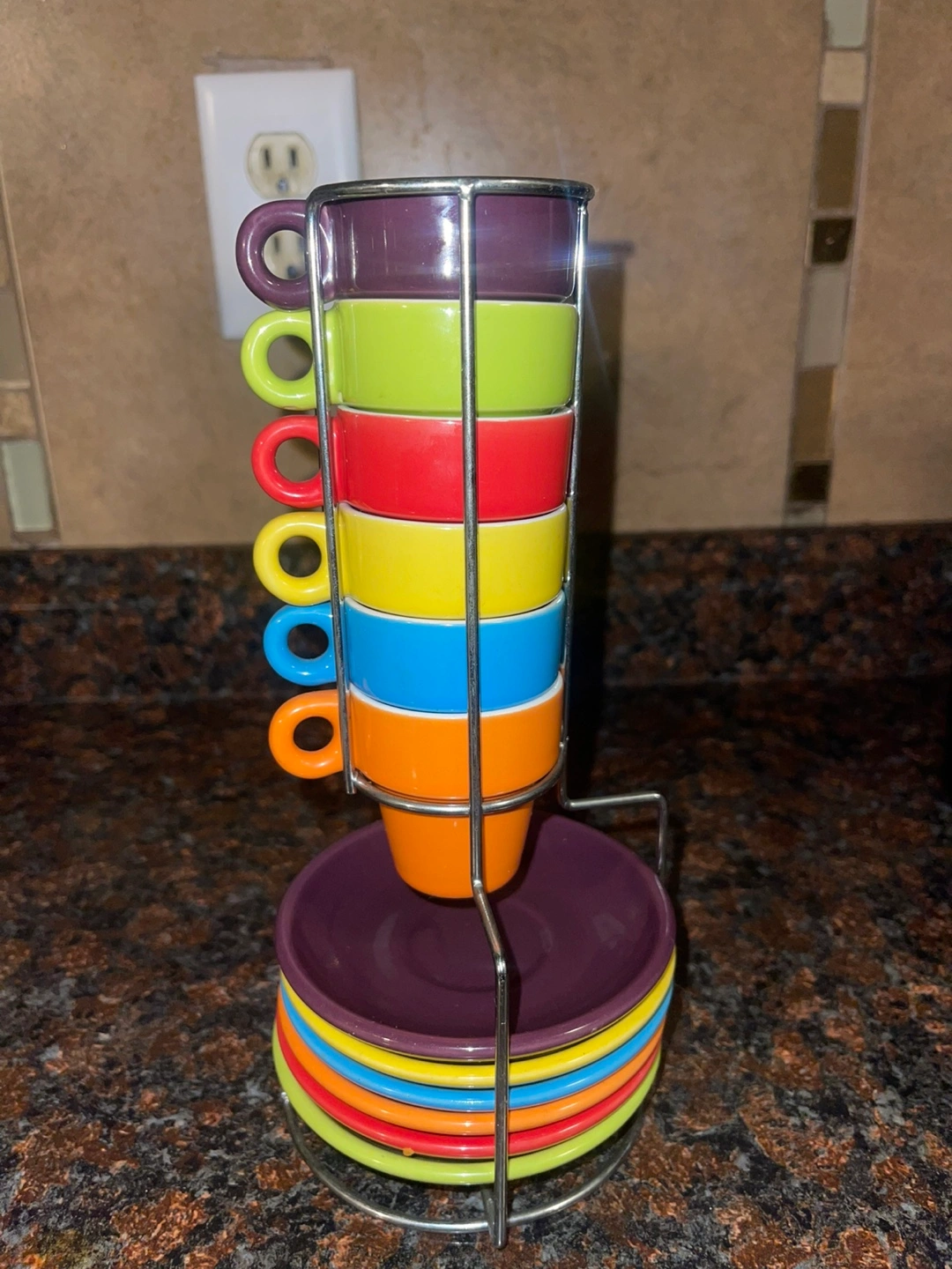 A beautiful set of colorful espresso cups with matching saucers. Includes a metal rack to neatly store your cups. This set would make a great gift for any coffee lover.