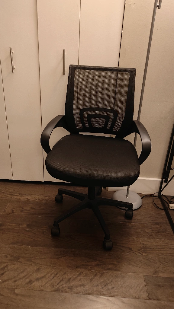 A comfortable office chair. Features a mesh back and padded seat. Its armrests curve gracefully. A perfect addition to your workspace to help you focus your mind.