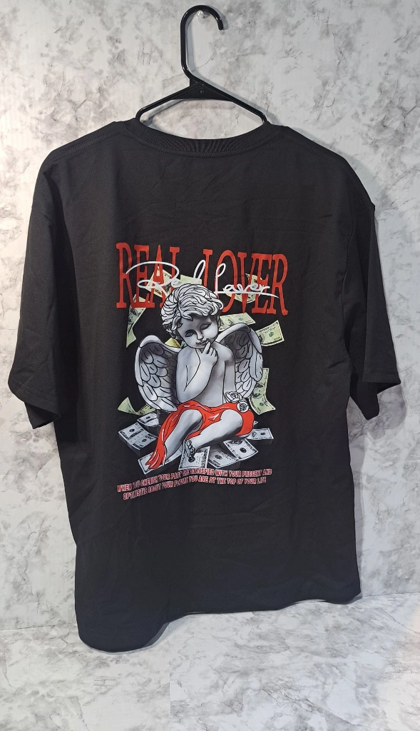 Level up your style with this eye-catching "REAL LOVER" graphic tee! This black, soft-touch t-shirt features a bold, unique design with an artistic cupid amidst stacks of cash, and the powerful message: "WHEN YOU CHASE YOUR ARTISTIC FREEDOM AND YOUR MONEY, AND OPTIMIZE YOUR TIME, THEN YOU ARE AT THE TOP OF YOUR LIFE."