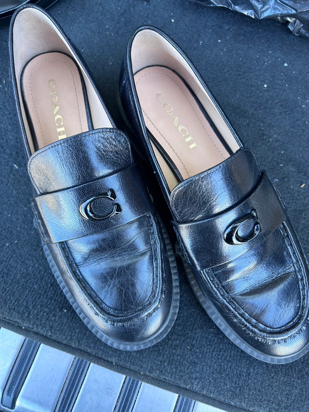 The shoes are black loafers. Features a thick sole with a buckle detail. You can wear these on many different occasions, and they'll make you feel good.