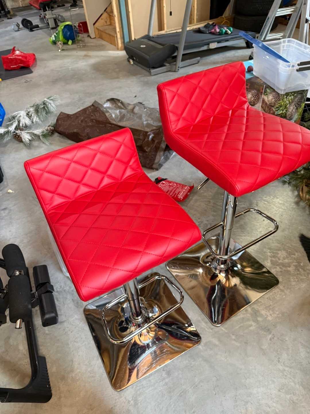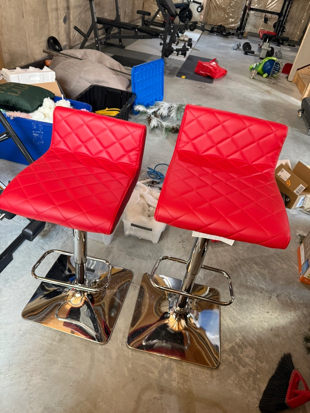 Offering a pair of bright red bar stools. Features a quilted seat. The stools have a shiny, chrome base and a footrest. Perfect for creating a cozy and inviting space for you and your guests.