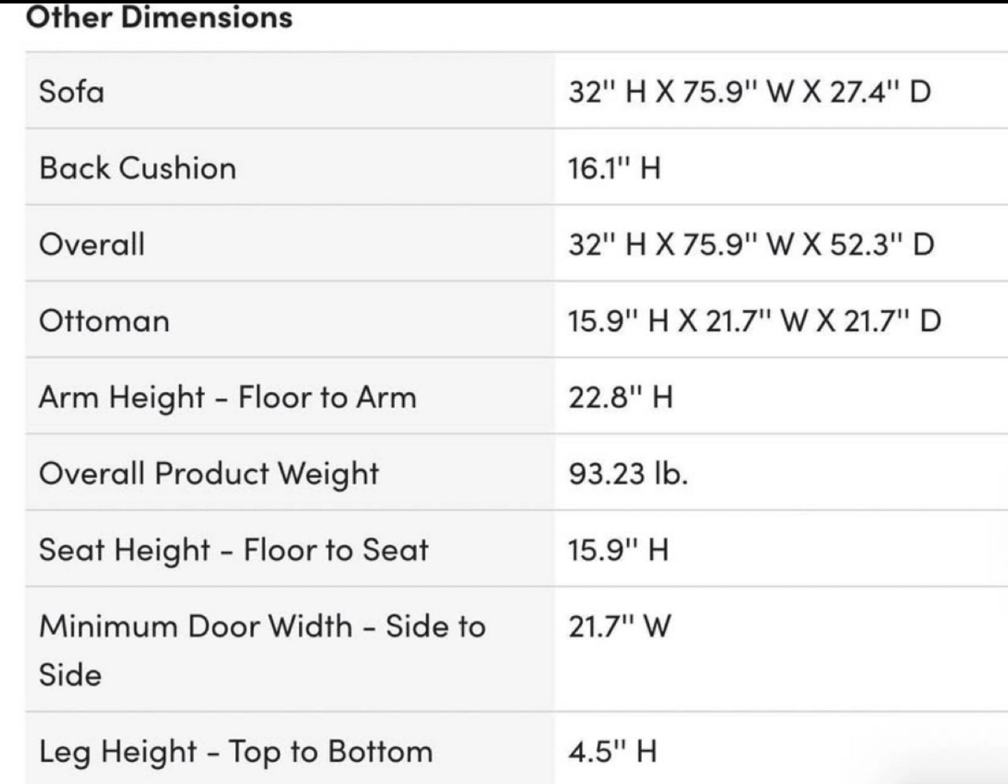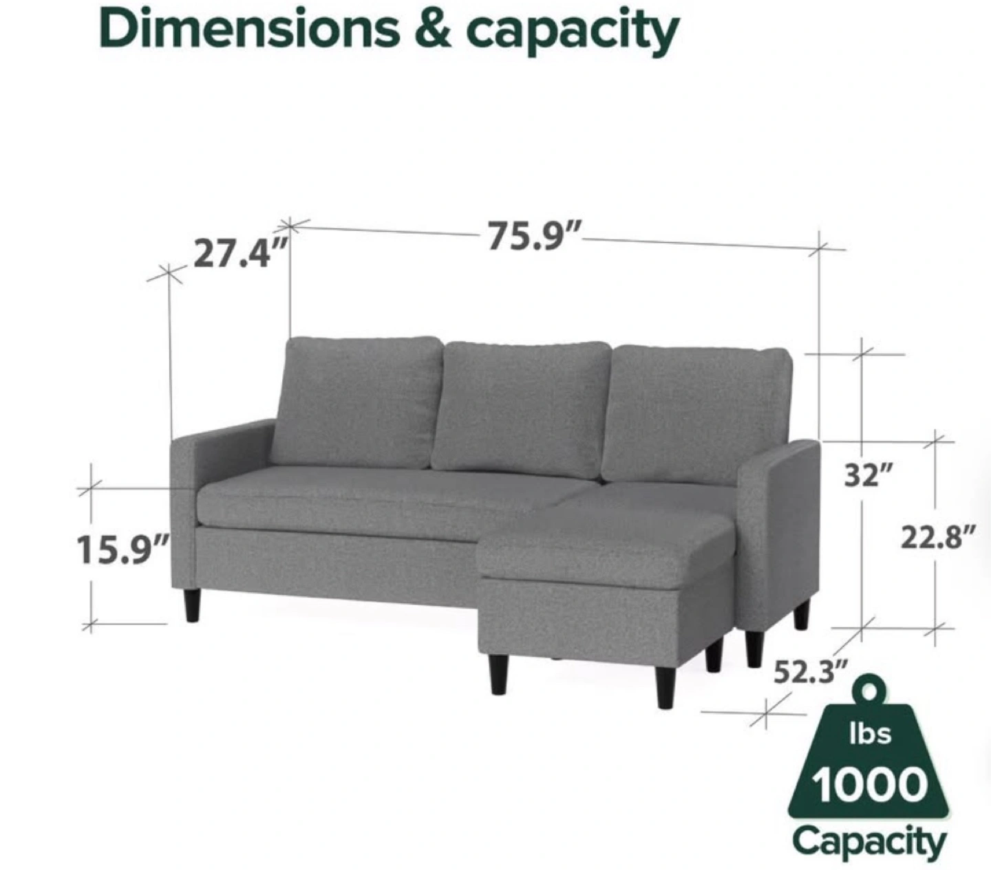 A stylish sectional sofa featuring a gray color and an ottoman. Great for snuggling up with a good book. It has a capacity to hold up to 1000 lbs. Bought on Wayfair Flex on price, really need it gone!!! Can be taken apart. Some wear as it's 2 1/2 years old. Dimensions included above. Bought originally for $433 Cushions/Blankets not included. PICK UP ONLY! Cross-posted from fb marketplace